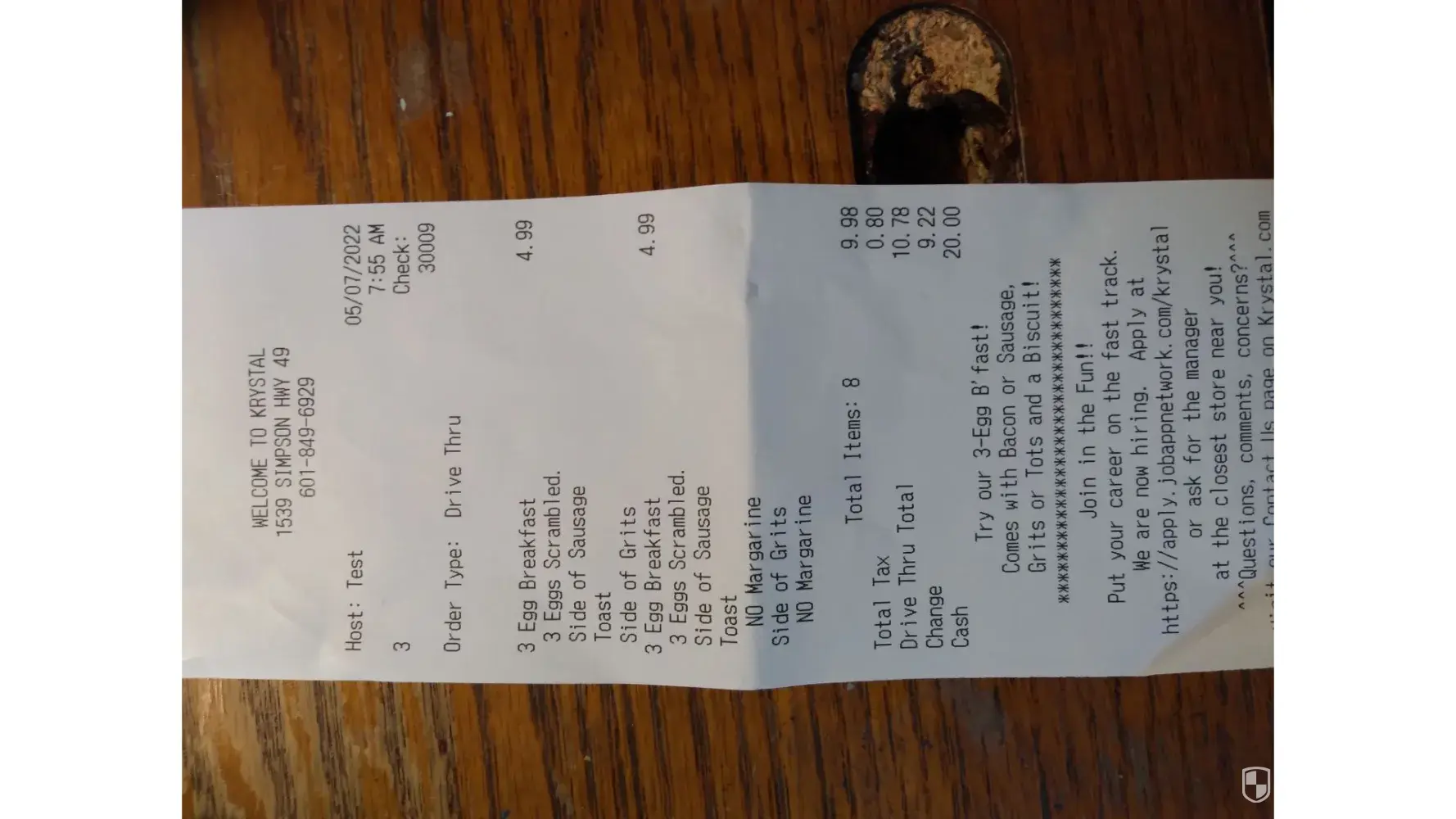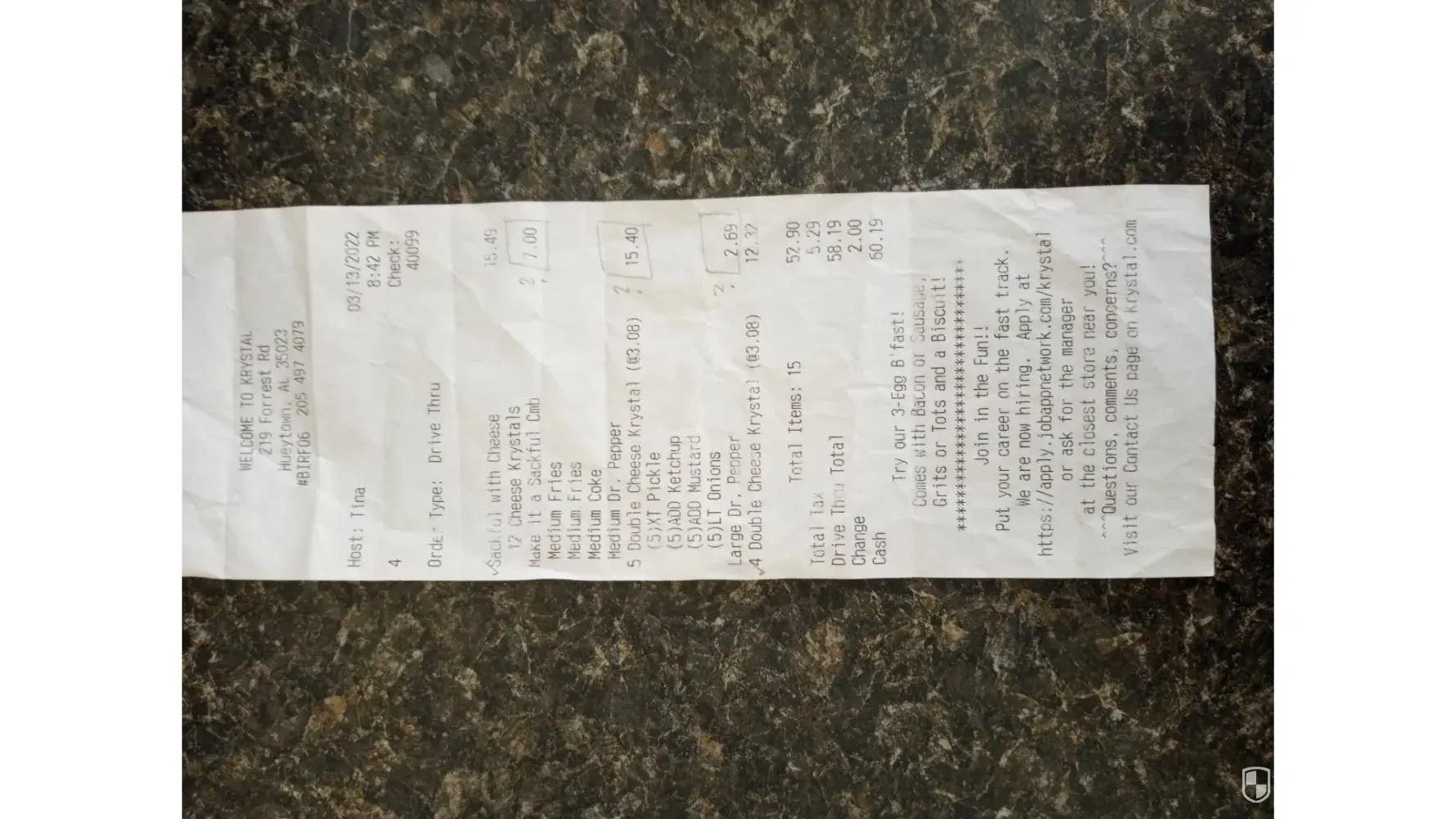On 3/13/2022' my family was visiting Alabama and stop by the Krystal location in Hueytown, Al 35023 for your delicious burgers. We waited patiently in line at the drive thru to order. Our order was 12 sacksful cheeseburgers which included 2 med fries and 2 med sodas @$15.49. We also ordered 4 double cheese burgers @$12.32. The employee even repeated our order. Moved to the pay window and pick up window and was told cash only and told our total was $58.19. We questioned our total and she got upset and asked "do we want your food or not'? Why argue with the customer? She gave us our food then our receipt after I ask for it. I did not go back to the drive thru window because it was late and the line was long. We did enjoy our burgers! My concern is being charged for items we did not order or receive. I want to bring this issue to your company's attention. I sent a letter and copy of the receipt to your company by mail. Thank you Ellen Shortridge ([protected]@gmail.com)