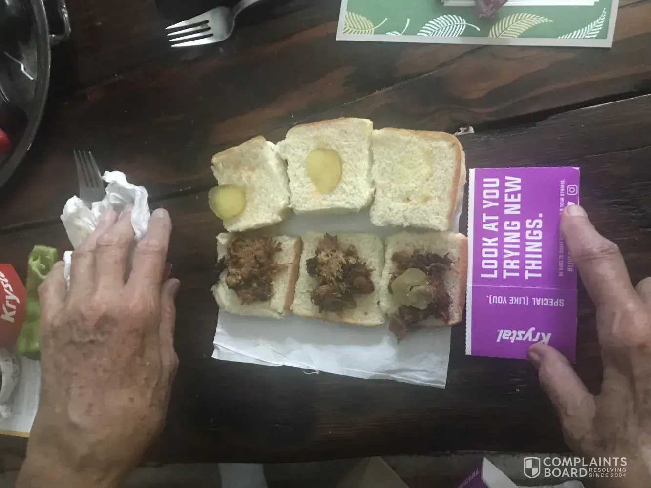 I ordered my first delivery from Krystal this afternoon. I received 4 dried up turds with a pickle. Here's a photo. Surely this isn't what you envisioned. I ate one and realized sometime isn't right.