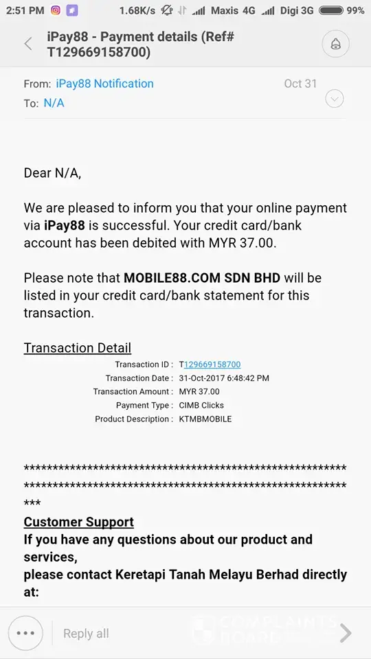 Good Morning, I would like to hereby complain about an incident happen last night regarding KTM services .Last few days my friend Mr.Lye bought a ticket using online payment, the system stated there paid and there was a proof of transaction history as proven below, but yesterday when Mr.Lye went there during the morning he was told that there was a system problem and they would refund him back the money and he was ask to bought another ticket but for a later time because he had an urgent matter to go back home yesterday, but because of the system error his trip was delay from 6pm noon to 10pm, it is alright the staff did apologize and said they will refund him, so he bought the next ticket he could get to go back home as soon as possible, I was not aware when I was using my ktm student card at the time with my friend the staff accidentally bought the passenger name under the card owner name and not my friend name (Mr.Lye), the staff did not even ask anything regarding the passenger information and so we taught that we have already bought a ticket for him.Despite after the staff check the earlier ticket bought under my friend's name(Mr.Lye) the staff did mention his name also before the staff said of having a refund, but still the staff open the ticket name under the card owner which is me instead of the passenger.What is worst when he went inside the train on his way home, your train staff who is assign to check for ticket identification ask Mr.Lye for ticket identification proof and my friend IC,