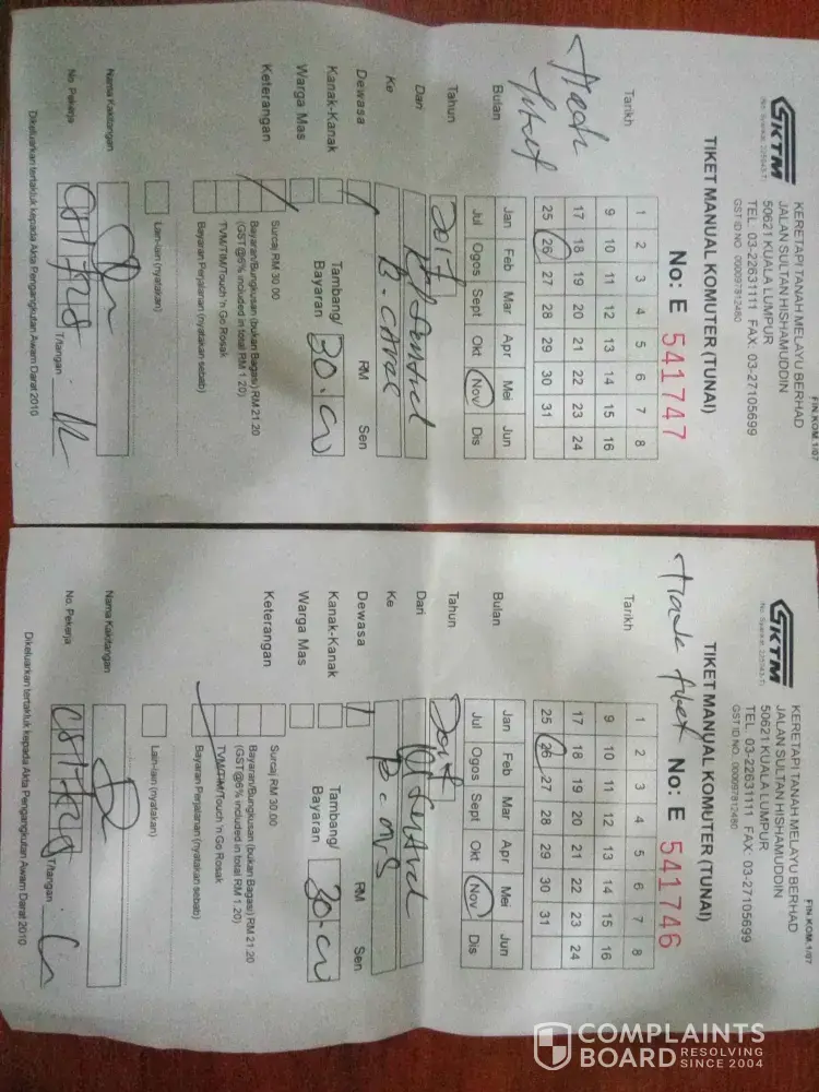 We return back to KL Sentral and report to the counter, they directed us to ticket office. There I try to make complain but they refused that today is Sunday we cannot accept it. Now I had to know what is the exact problem? Is the problem due to internet, or purposely the KTM is planning for fine collection. Whether I had no rights to ask receipt for tickets. What is the punishment for Mr. Manuddin? He was behaving cruelly when I ask receipt and unnecessarily taken RM150 from us. If we gave him RM 75 without receipt he will put in his pocket. Did the KTM head know about this Manuddin's under the table collection? I had herewith attached the receipt scan copy and the photo of Manuddin. If the KTM want to be corruption free then please take action against this Manuddin behaviour and try to avoid unnecessary collection from passengers. I am very much sorry to complaint this information. Since I was mentally upset I am posting this complaint. Kindly reply me the actions taken. Complaint has been forwarded to KTM call centre and inquiry department. Please imagine how much collection per day Manuddin will get.