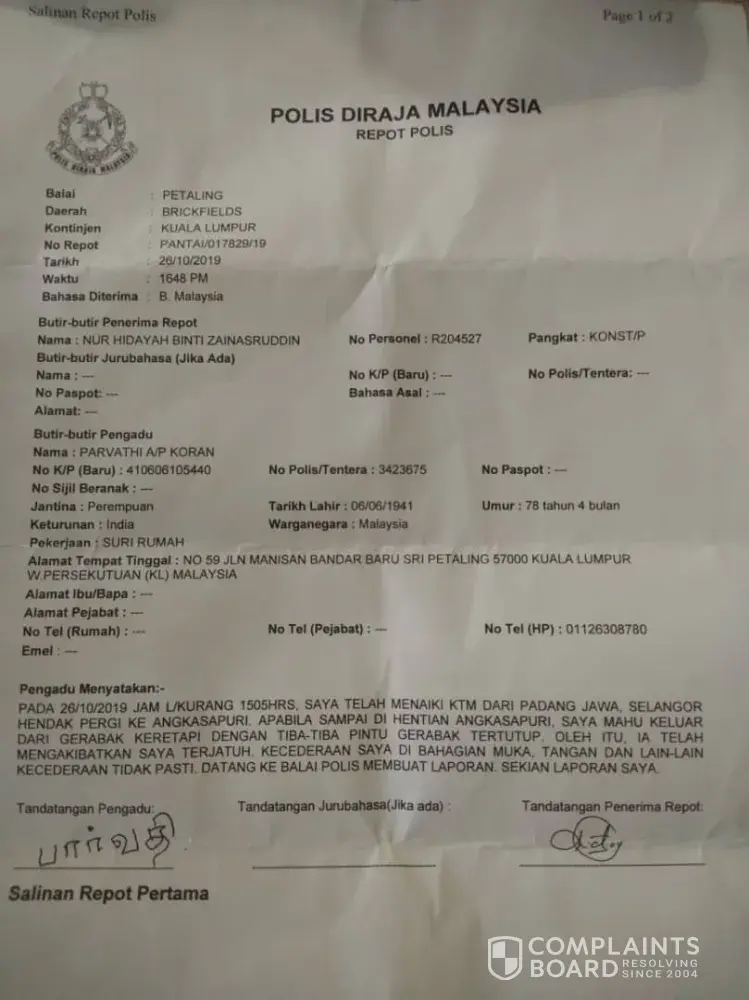 Pada 26/10/19 pukul 3.05 pm nenek saya menaiki ktm dari padang jawa turun ke angkasapuri, semasa turun, pintu telah ditutup dengan cepat menyebabkan nenek saya tersepit dan terjatuh kebawah, luka di bahagian tangan muka kaki dan lutut. Pemandu ktm tidur ke masa berkerja? seronok sangat sembang dengan rakan sekerja sampai tutup pintu cepat. Kerja tak fokus, leka . Perkerja sebegini sepatutnya digantung kerja. Nasib nenek saya tak luka teruk, bayangkan kalau jadi dekat ibu mengandung atau orang oku?