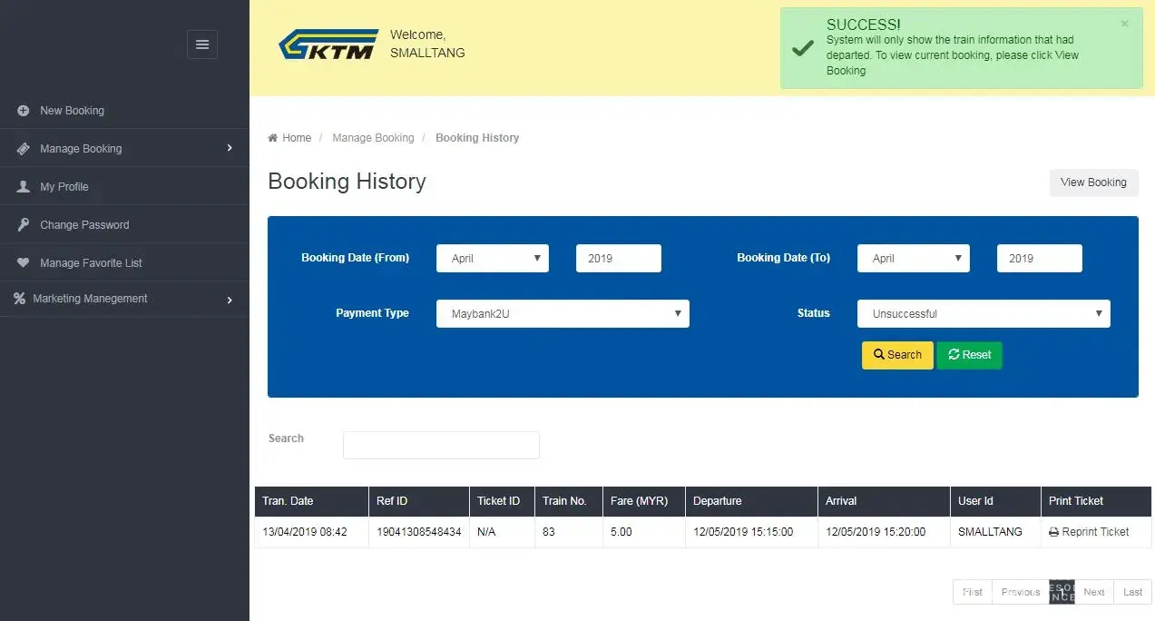 I'm brought e ticket this morning but that's no transaction record and my ticket appear on my ktmb account. But bank transaction was successful. Please check and get reply me as soon as possible. Thanks.