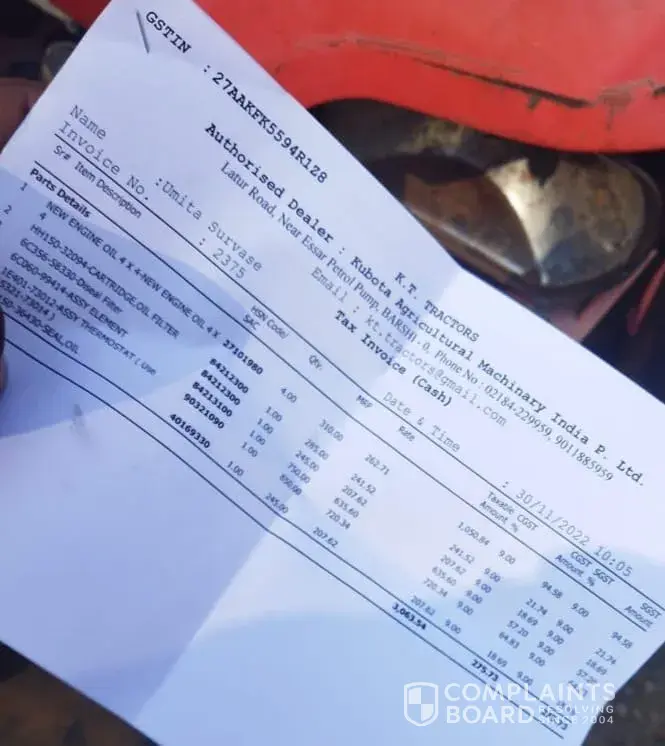 sending Kubota tractor documents and also bill of your showrooms service bill dated 30-11-2022 and within 7 days tractor stopped working because of coolent. this type of servicing done by your companies showroom.