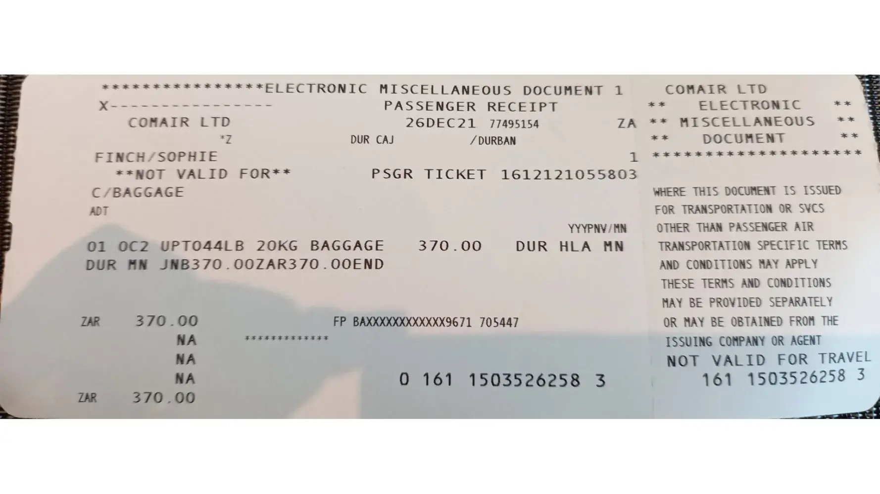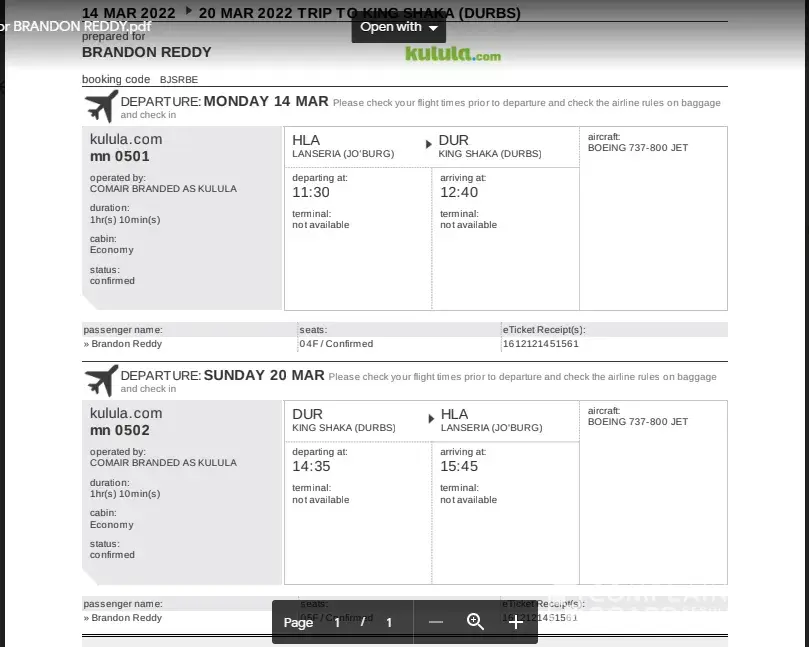 Elmarie van der Westhuizen – booking reference JHQDCP flight MN108 2nd April