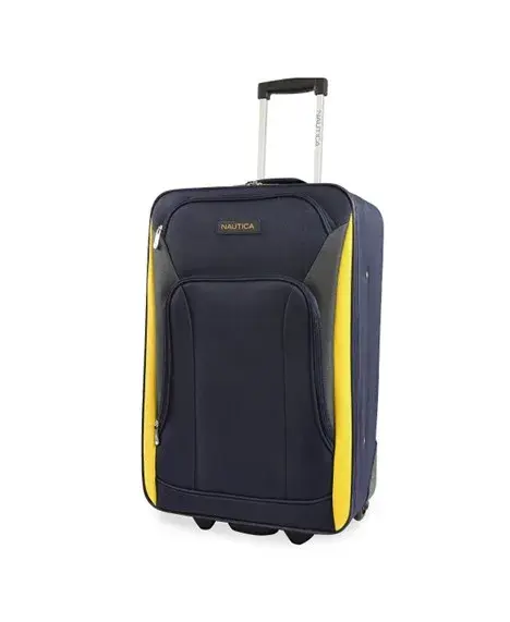 The checked-in baggage is a dark blue Nautica soft luggage.