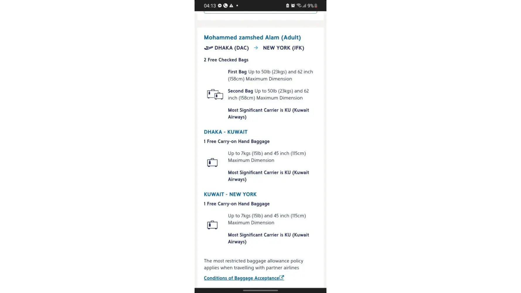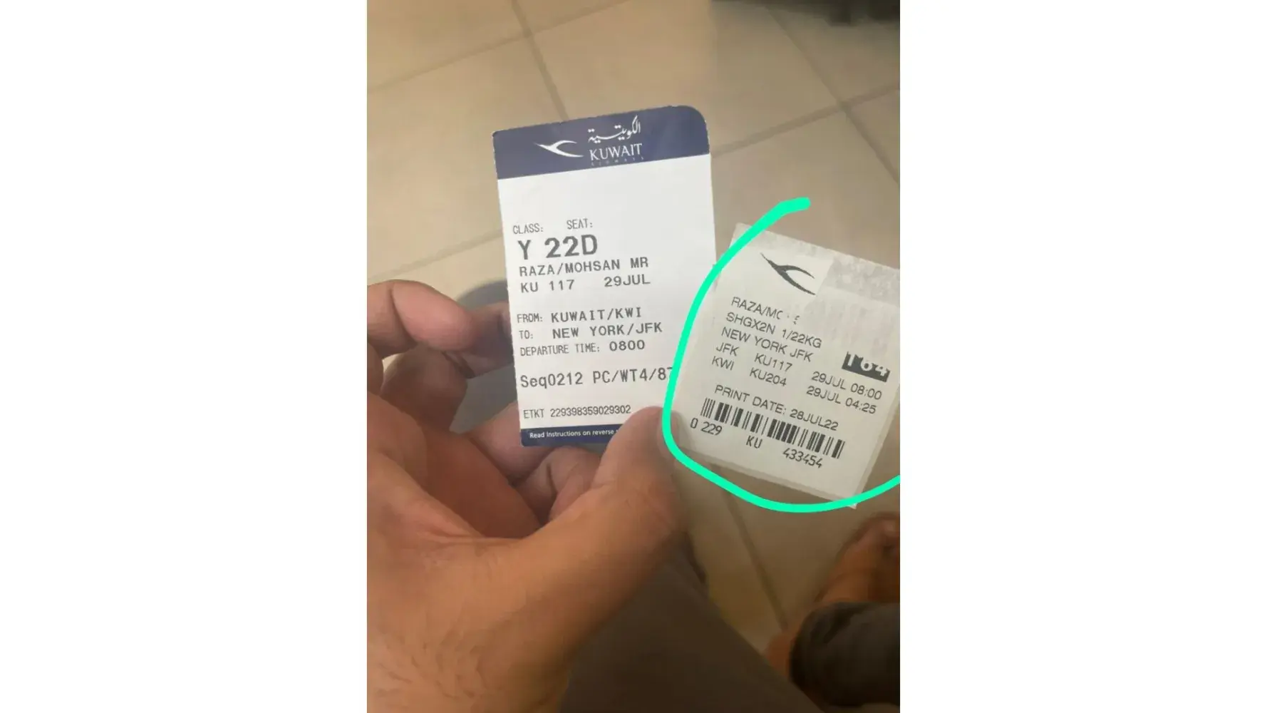 I travelled from MAA to JFK via Kuwait on April 29, 2022.