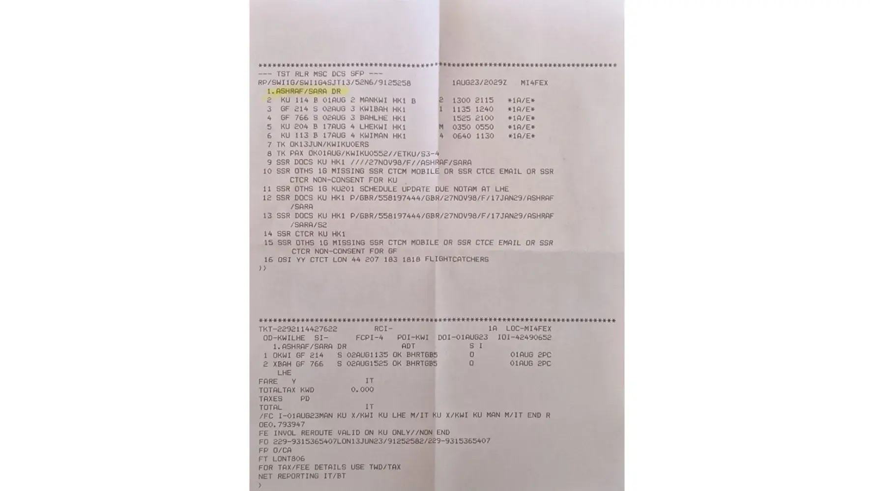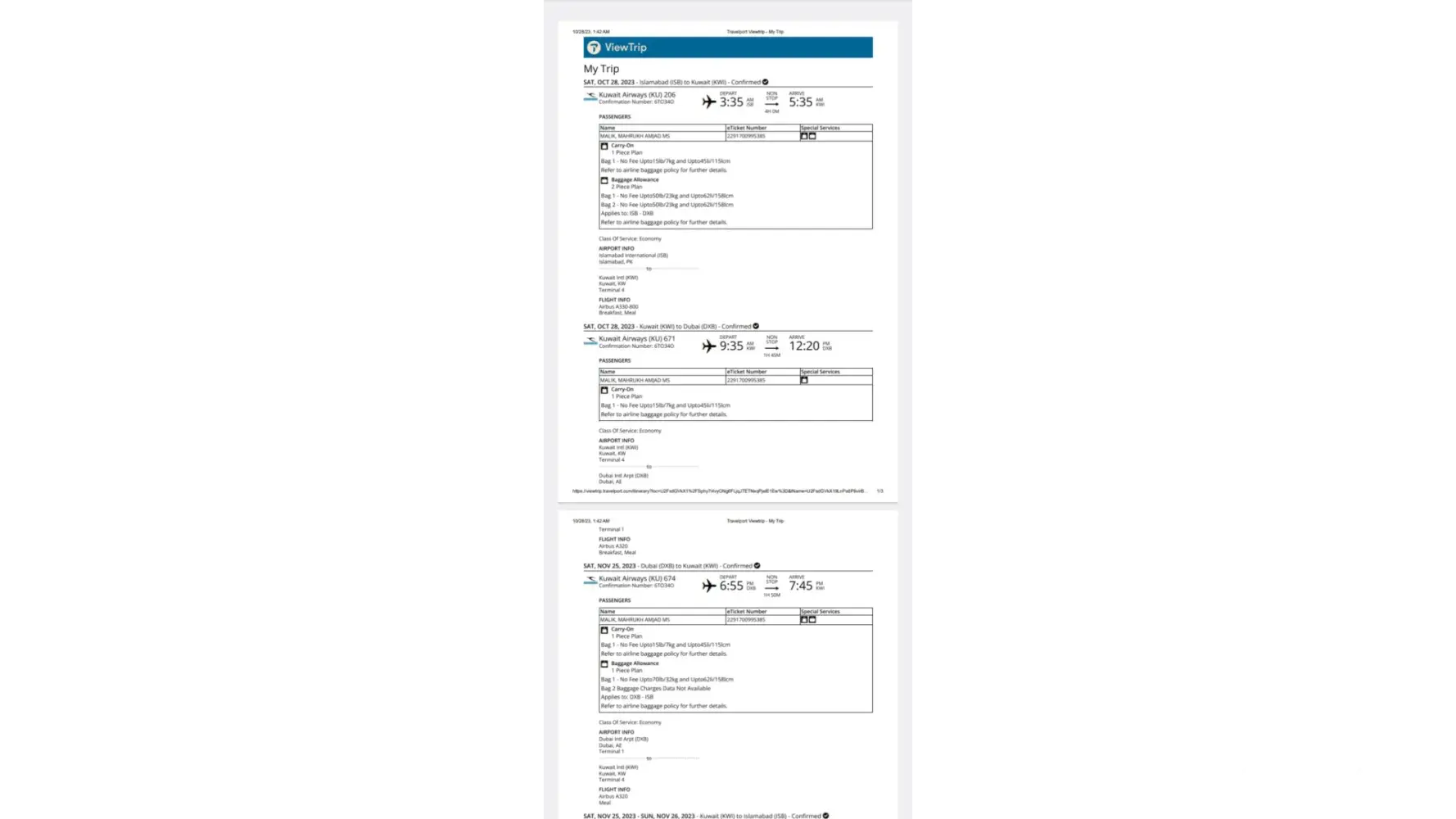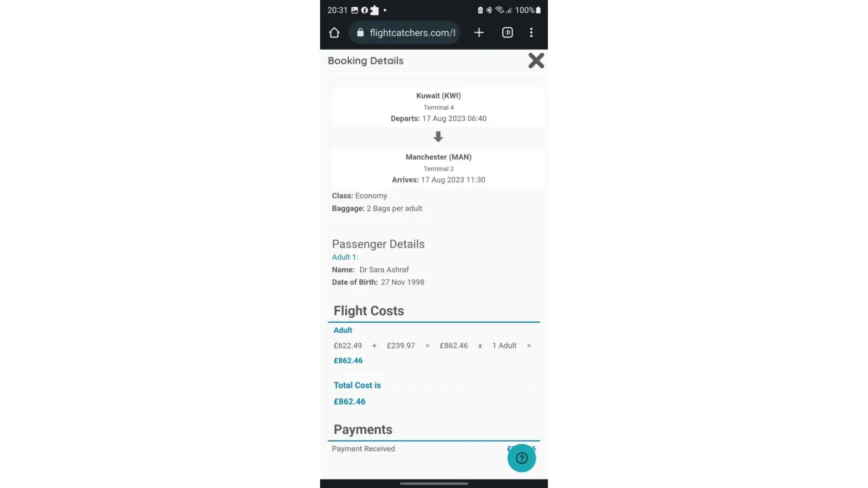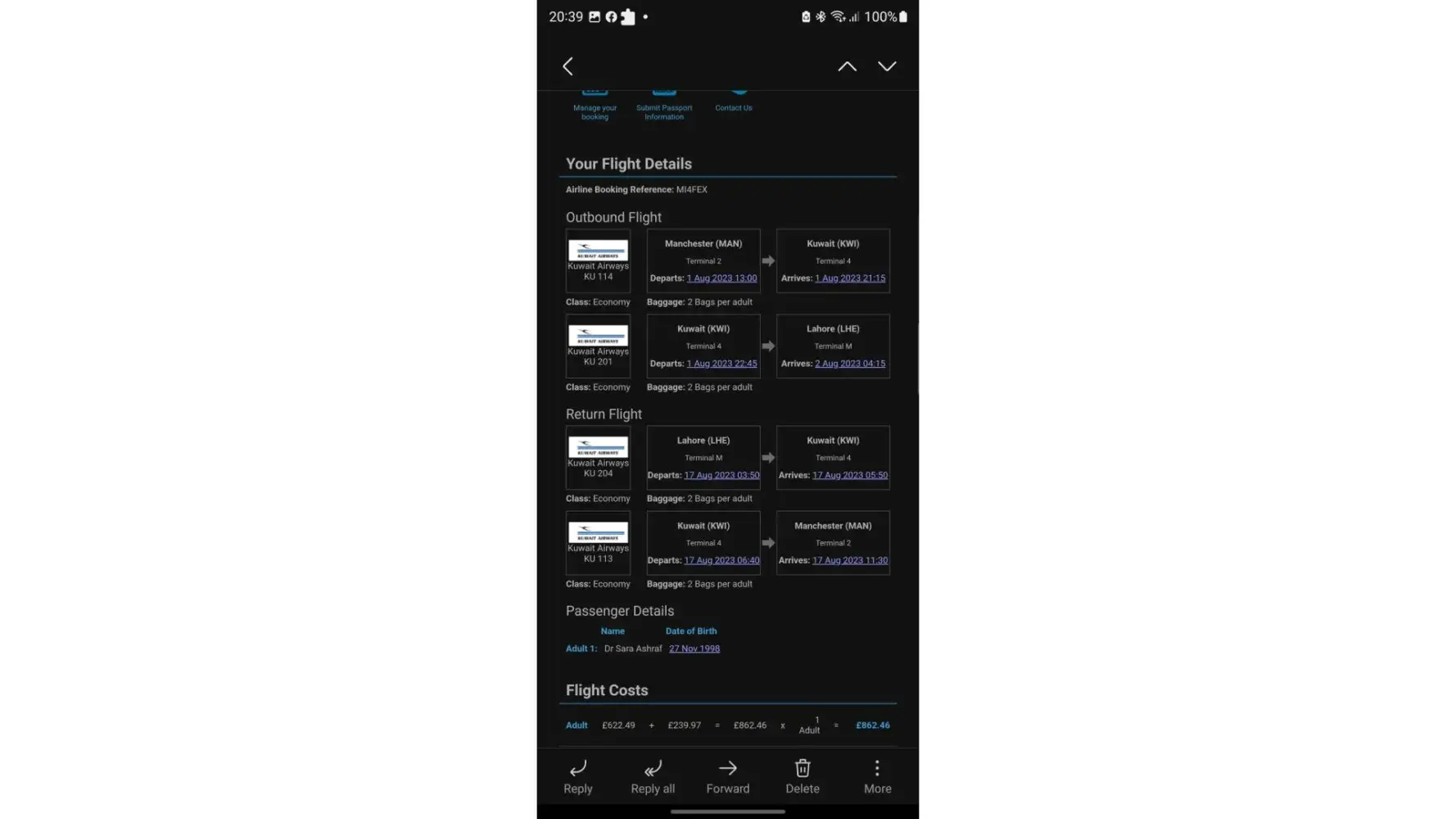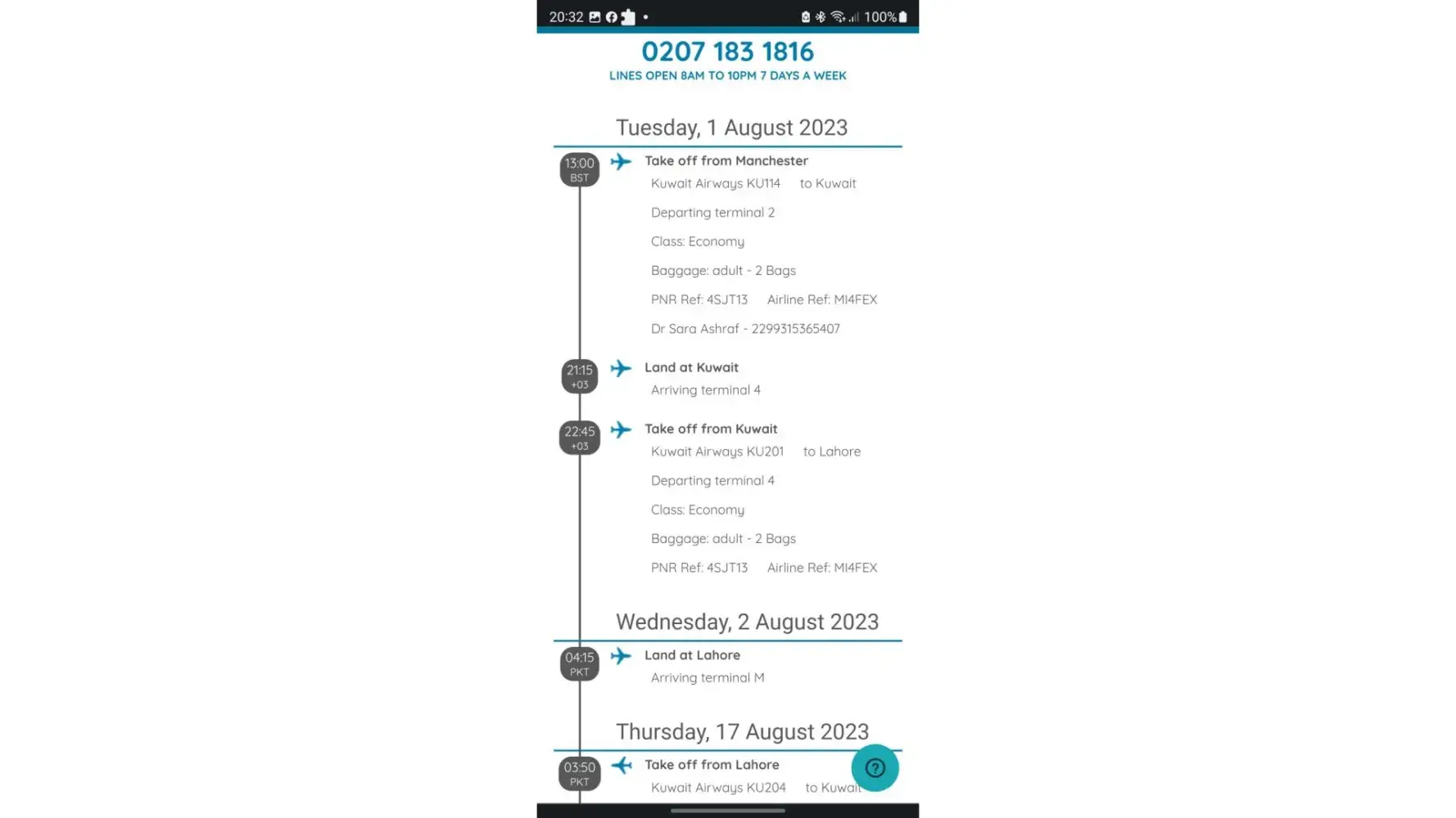 My name is Sara Ashraf, I have recently flown with Kuwait Airways from Manchester to Lahore plus return. (01/08/23-20/08/23)