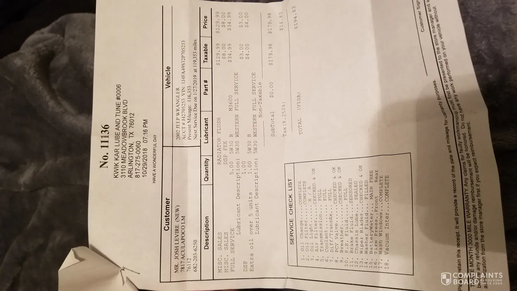 So on 12/19/2017 at about 5:25pm I got an oil change in which I purchased an air filter for my engine I was told. I asked to get my vehicle inspected also and they said they couldn't and I asked again after and he said to come back Sunday (today Christmas Eve) logical. A few days later I located a piece of random plastic behind my glove box when I could not close it. I would assume that it was from the attempt to sell me a filter for my air conditioner. And then my pressure gauge light came on so I went back on 12/23/2017 at approximately 3pm and asked them to put the plastic back change the air filter and inspect the vehicle now one day later my maintenance required light is on... shocker. There is also missing water and at least one inhaler out of my car. What will you do for me?