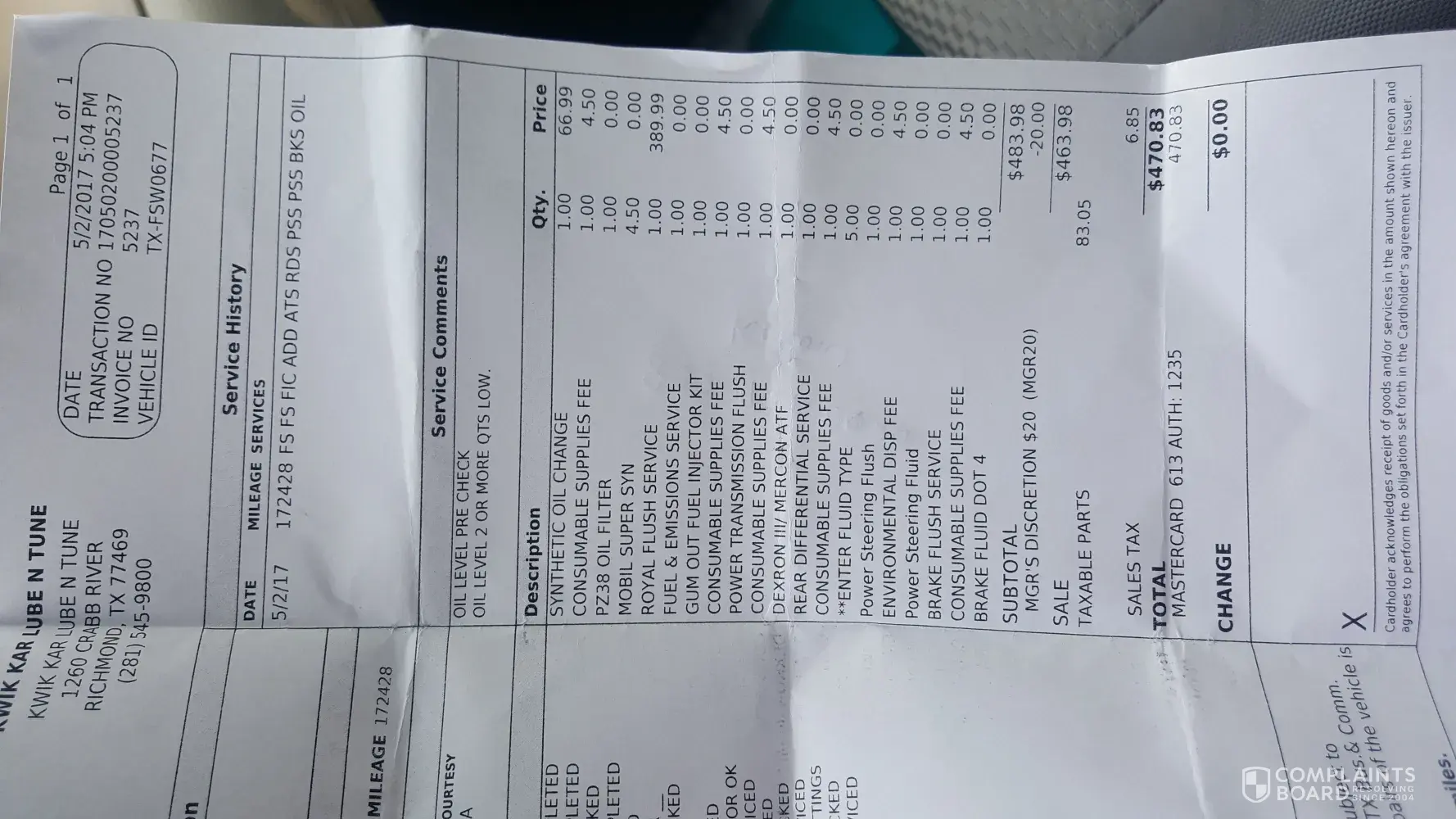 I took my car for a state inspection on 5-30-15 at 51, 618 miles They charged me for Power Steering Flush 79.99 Brake Flush 79.99 2x disposal fee 9.00 I took my car to Lute Riley Honda on 8-22-15 at 55, 617 miles Was informed my power steering flush and brake flush were dirty and need done. When I called kwik kar, Curtis Barryer, he argued that Honda i...