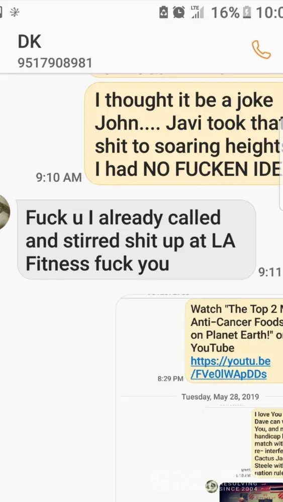 Hello I am Jason P My phone nunber is [protected] I am being threatened and harrassed by one of your memebers. I and my family are long time members. This person harassing me is named John Anthony Lopez: his phone number is (951) 790-8981 and who's phone number is at the top left of my provided screen shots, is physically threatening me via a recent phone call, and is calling the gym facility and spreading false rumors and accusations against me. I want to attend Your facility in peace. Please revoke His membership so I can feel safer, and so he doesn't cause any disturbances at Your facilities. He is a Googleable professional fighter and again I DON'T want a disturbance at your property nor have my father cancel everyone's membership that he pays in our family also. Please and thank You. I am very offended of his false abusive actions, and fear for my safety while I'm at your property wheras it's the easiest way for him to find me. Thank You very much.
