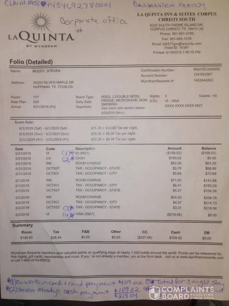 Husband and coworker split the cost of a 3 night stay at Laquinta Inn & Suites Corpus Christi South. Coworker paid $109.02 on his card ending in 9851, my husband said up front that he was paying cash for his half. My card was also charged the exact same amount for the entire stay and said it would be refunded in 7 to 14 days. Wyndham Rewards# 146354426C...