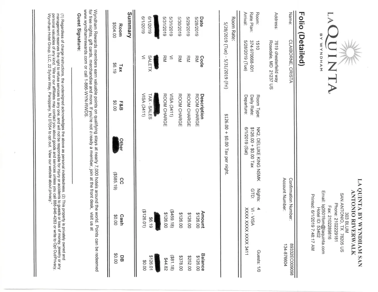 Account #[protected] Wyndham Rewards #185796467G check-in: 06/11/2019.