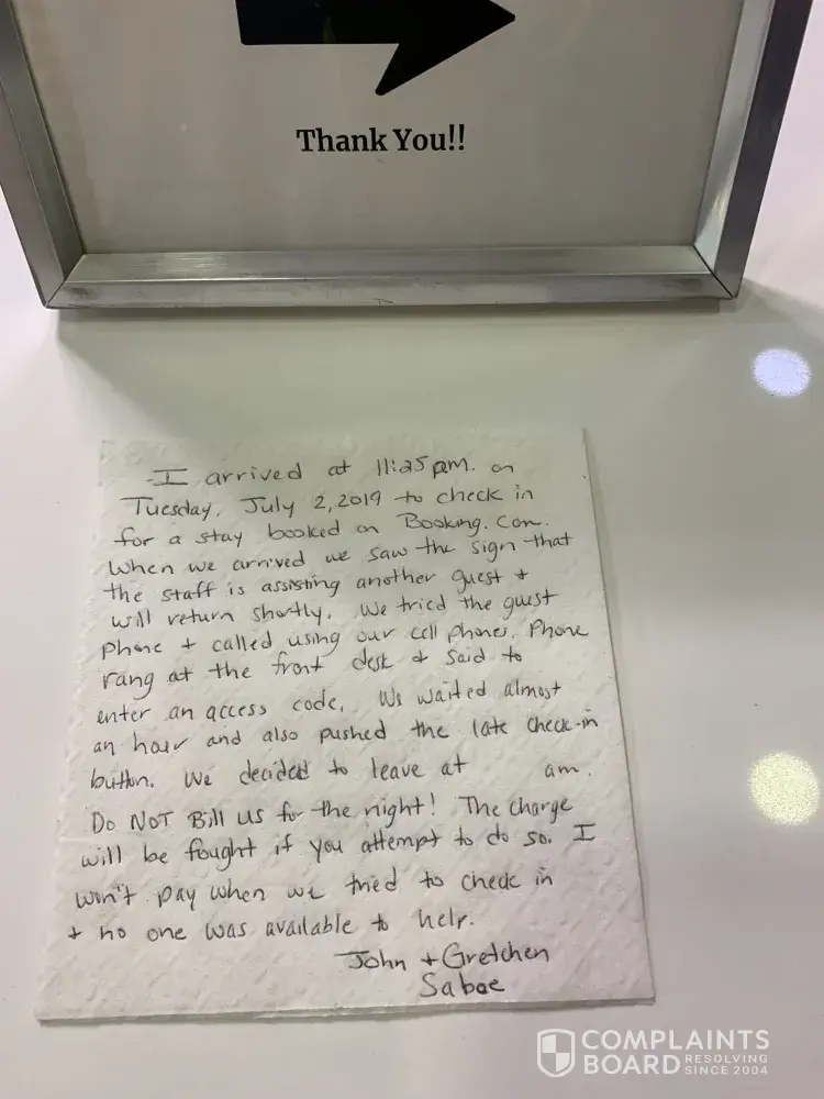 We had a reservation through booking.com and arrived on July 2, 2019 at 11:25pm at Laquita Inn and Suites in Bowling Green, KY. Upon entering, we were greeted with a sign that said the staff was busy assisting another guest and will be back shortly. It said to use the phone to the right to get assistance. We waited and then used the phone which rang to the phone on the desk and asked us for an access code. I tried using my cell phone and used the number on the website and got the same result. Another guest came to the lobby and said she had seen the lady staff earlier there talking on the phone about how hard it is to raise a baby on her own. We waited until 12:15am, wrote a note on a napkin and left it on the desk saying when we were there and to not charge us. I'm sure if security footage is checked you will see us waiting all that time. We had to go to the nearby Microtel by Wyndham to get a room and checked in at 12:35pm. We had an 8 hr drive that day and just wanted to sleep to prepare of our 9 hr drive the next day. I called La Quinta Inn on July 3 and when the staff checked she said she didn't see anything about my note I left and said my reservation had been cancelled with no charge. It would be much appreciated if Wyndham would try to make this right with us by refunding us the Microtel in Bowling Green's charge. I did take a picture of the sign left by the attendant with my napkin note next to it if you need it. It was a very frustrating situation. Gretchen Saboe. [protected]@yahoo.com