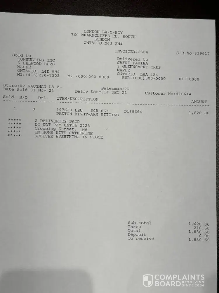 We purchased furniture at La-z-boy in November 2021 and were told by our sales consultant as well as the finance rep. there that we would not be billed until the items were delivered. The finance plan we were encouraged to take was the payment deferred for 14 months plan, with the assurance that we don’t have to worry about paying any of it back until 2023. This was one of the main deciding factors to purchase. Because why should we be billed for items we have not received. The first delivery was Dec.1st, 2021, second Dec. 14, 2021 final delivery May/2022. That would make repayment due dates: Feb.1, 2023, Feb. 14,2023 and July, 2023