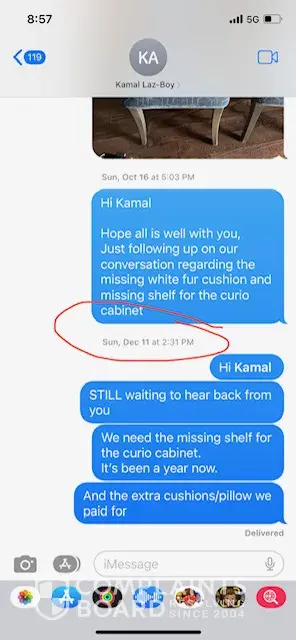 In first delivery there was a curio cabinet that was missing a glass shelf. We informed the sales consultant of that immediately. The second point of contention is the interest we were charged by Flexiti, La-z-boys financier. I received a statement which shocked me traumatically when I saw it! I called Flexiti to discuss the extortionate interest charged of $5366.49 on a balance owing of $4436.38! Despite several and constant follow ups: calls, texts, emails, visits to the store, messages left for and conversations with the sales consultant, and then the assistant manager, manager and customer service director, these issues have remained unresolved.