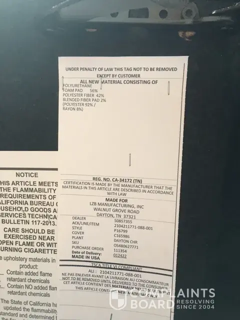 On 4/24/2021 I purchased 2 recliners, 1 was style 010777 the other SKU 10X724, from our local Lazboy Furniture Galleries in Huntsville, Alabama. Assistant Manager Jan Langiewicz waited on my wife and me. The sales Contract # was 119723 and we were gonna pick them up in Nov/Dec 2021.It was a week shy of a year when they called and said the recliners were in. I sat in many recliners before decided on one...all told it was $2437.24. While writing up the contract Jan Langiewicz repeated several times that the recliners were made in America...that was a big selling point. When I picked the recliners up, I left them in their boxes to bring home. To my utter surprise...and disgust...my recliner...still in the box...had Made in Mexico all over the box. While I am very disappointed my recliner was made in Mexico, after being told it was to be made in America, that is not what all my complaint is about. My main complaint is that, although it looks good, square and level, after setting in it for a while I realize I'm leaning to the right...I adjust myself to the middle/left only to realize after a while I'm back leaning to the right. Something is either wrong with the cushion or mechanism or something. I posted my original complaint on June 18, 2022, but never received a reply...ya'll responded to my request for a reply to my complaint...was told not enough information...so I am posting my complaint again...thanks