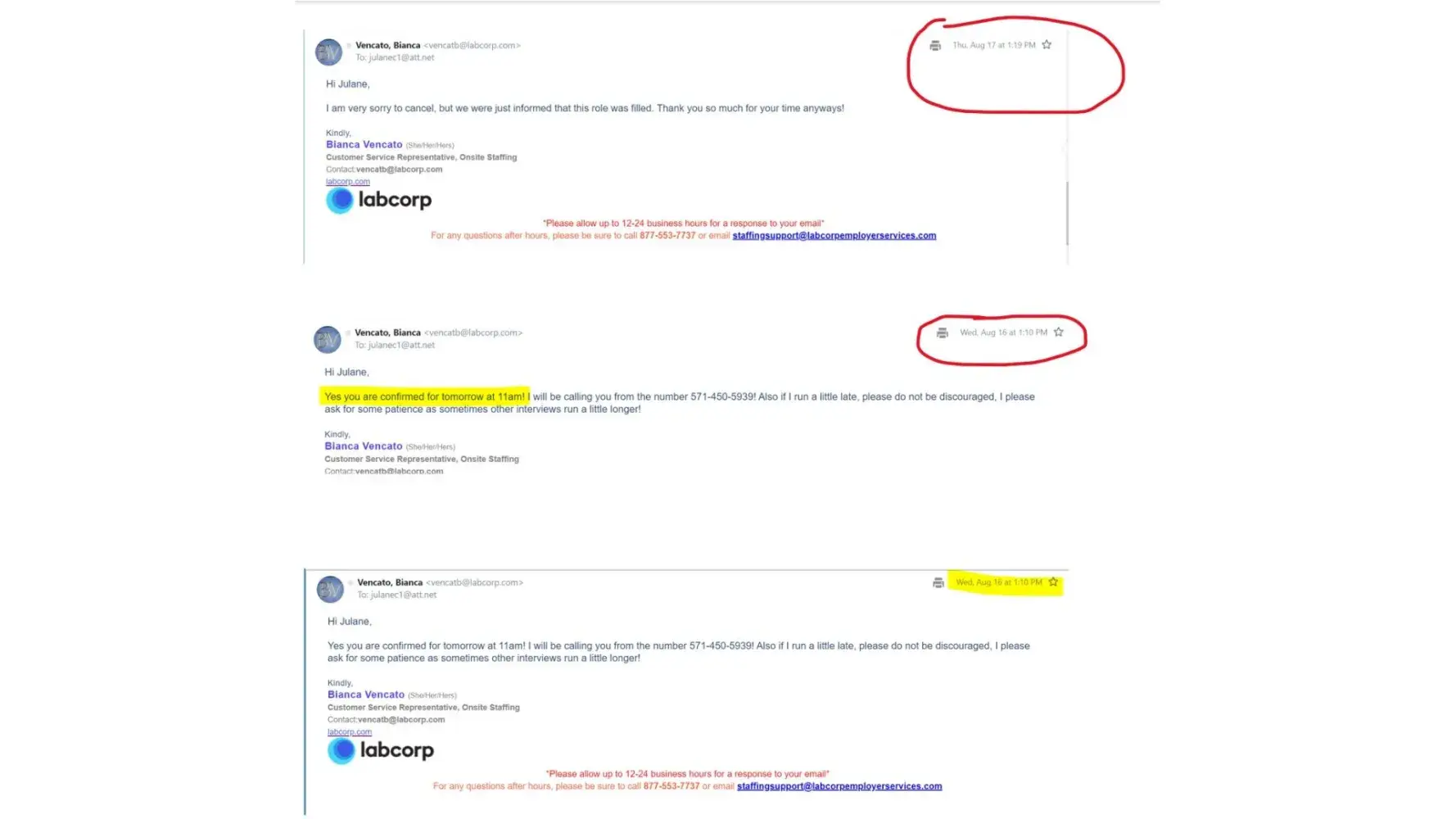 I emailed her yesterday @ [protected]@labcorp.com to confirm our 11 am scheduled interview. She confirmed.