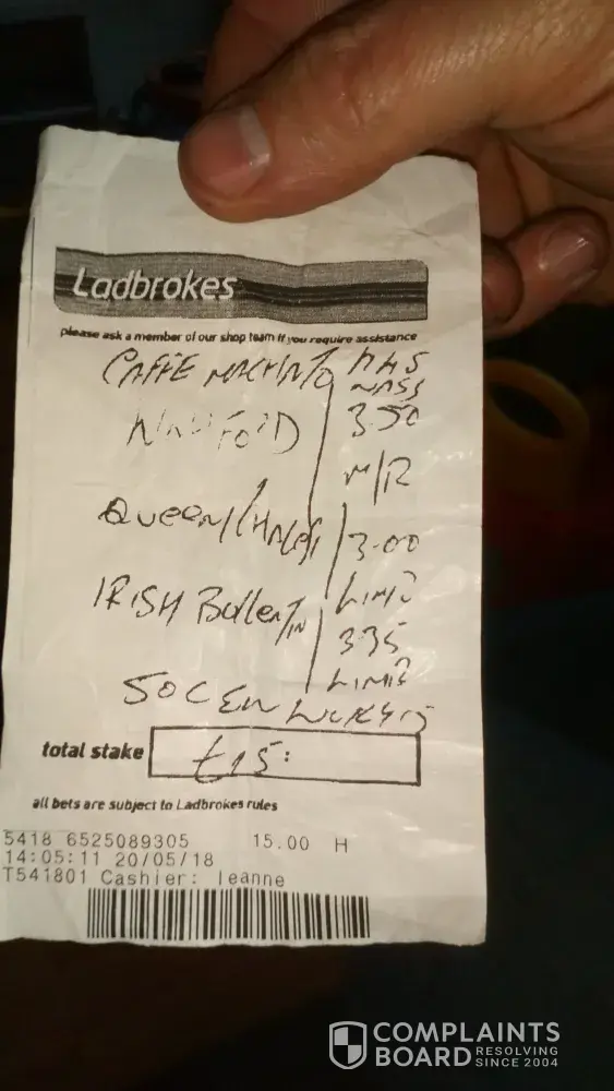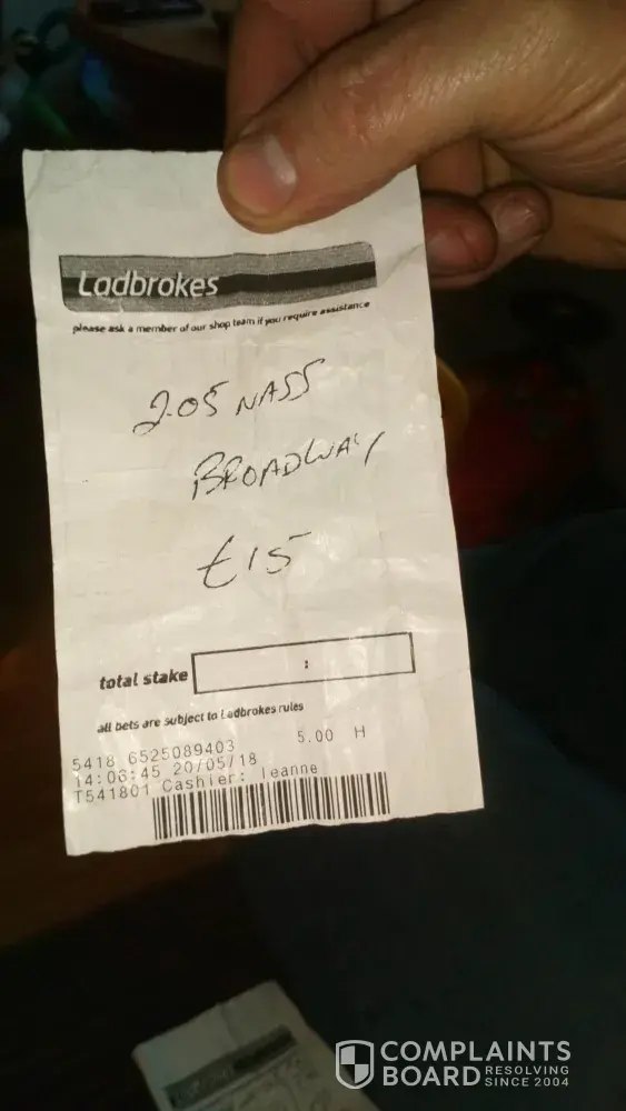 I placed 2 bets on Sunday at 2, 05, and the 1 I'm complaining about 1 minute later it was a bet of 15 euro on the favourite at nass in Ireland it clearly shows 15 euro win on Broadway 205, nass there were only 3 people in shop at time and 1 girl behind counter I just finished work on building site next to job I watched race and when horse won I had to rush mate was waiting out side in jeep I was on different job Monday so went to my local ladbrookes in killanarden which I use regularly and girl gave me back 21euro and 45 cent 9 something of the bet I had for 15 and 12 for other one I asked her to ring shop wasn't to helpful eventually did and the other person in the shop I done bet in said only done for 5 euro I asked for slips back its not a lot of money were talking about but the principle of it I feel very hard done buy I have a grid card for past 2 yrs or so but the way this has worked out won't be using ladbrookes again PS it clearly shows 15euro on docket why did girl not quirey my stake at time of bet been struck