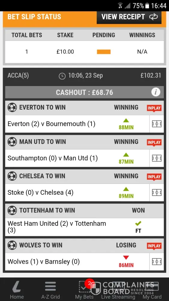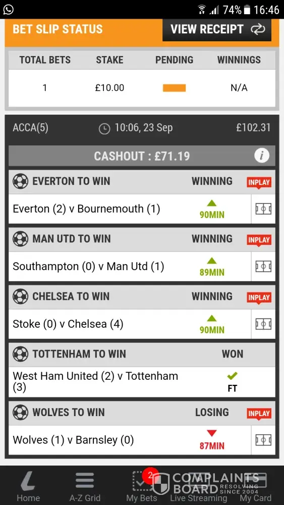Again the bet ended up winning but I wanted to submit a complaint as this is a disgrace and you will also see proof in the images attached that Wolves were winning amd the cashout kept rising yet it stayed saying 'losing'.