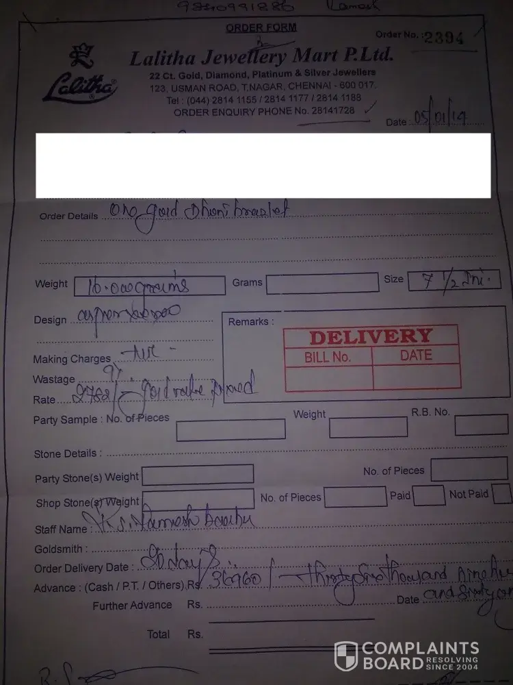 I have ordered bracelet at Lalitha Jewellery mart for my sister's marriage on 05th January 2014. Sales rep Mr.Ramesh ([protected]) promised me to deliver bracelet in 20 days, but now near to 30 days crossed and they are still not sure when they can deliver. Their advertising wastage 7% for most of the jewel's, but i got billed for 9% wastage. Worst part is even if I call sales rep number he is not answering the call and not getting proper response from order enquiry phone([protected]) rep also.