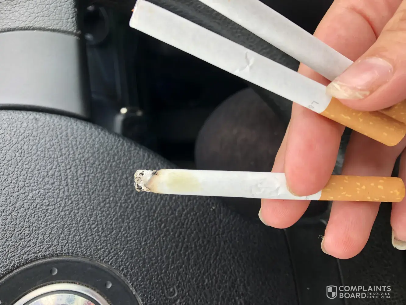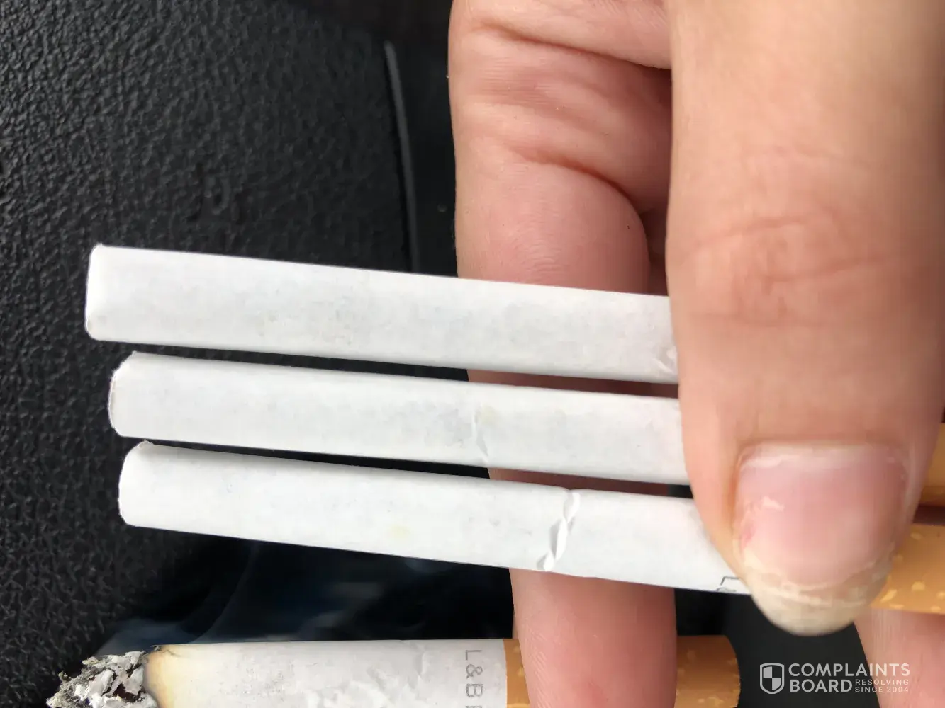 I am a regular smoker of your Lambert and Butler Blues. I went to light one this afternoon and noticed there was a thread protruding slightly at the end. I opened the cigarette to find quite a substantial amount of white string inside? I have smoked your cigarettes for almost 20 years and spend around £70 a week on them. I understand that the tobacco is of a lower grade, but this is unacceptable. I have attached photos.