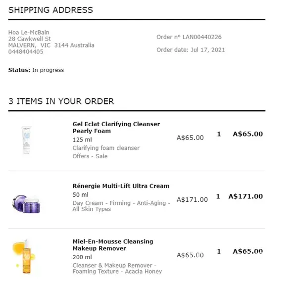 I bought 50ml Renergie Multi-lift Ultra cream(AUD171) on 17 July 2021, together with other products (cleanser, make up remover). Order No#LAN00440226