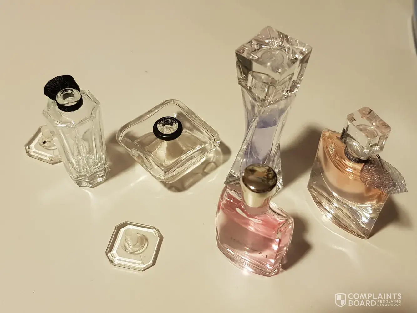 I purchased the above bottle of perfume from a store whilst on holiday in Benidorm, the bottle has been placed on my dressing table for the past several weeks with no problems but this morning I picked up the bottle to spray when to my amazement I realised that the bottle slightly stuck to the dresser, when I lifted the bottle up paint came away from my dresser which may I say is only a couple of months old, the mark on the dresser is the same shape as the diamond from the bottle and paint from the dresser was stuck to the bottle. I have very serious doughts about what is in the perfume for it to ruin my dresser, I can send pictures and receipt from when I purchased the perfume and the dressing table as this is very serious and want this replacing, I would like my complaints taken very serious and await your response to the above ASAP