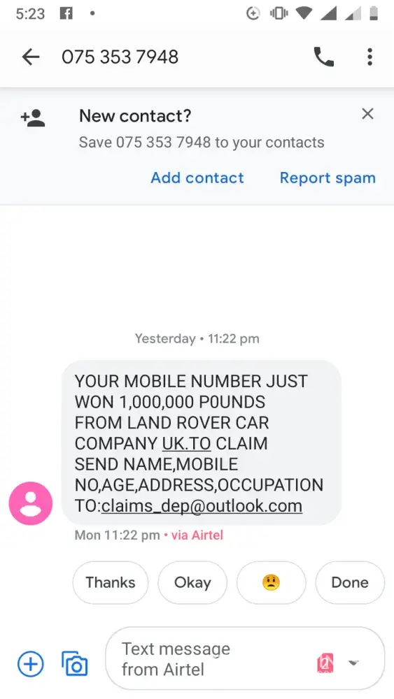 He informed me that I win a land rover car and he is going to deliver me tomorrow but at first I have to pay a money of 12500 rs
