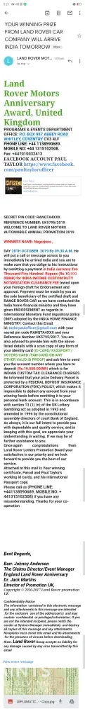 We wish to congratulate you once again on this note, for being one of the lucky winners selected for this year land rover range rover motors mobile promotion 2020. We felicitate with you and your family and especially for being a citizen of (india). This promotion was set-up in united kingdom by land rover range rover motors to encourage prospective mobile users. Congratulations on behalf of the 'land rover range rover motors promotion united kingdom' our screening committee and national advisory board has completed all verification and screening by the screening committee of "uk's overseas national advisory remittance claims unit. You have been approved to received your demand draft and land rover car by a special delivery agent arrival been approved by the regulation council of the land rover range rover motors promotion 2020. Your cash prize of four crore rupees (rs, 4, 00, 00, 000/inr) will be delivered safely to your door step by diplomat mr. Edwards maxwell, having considered all possible measures to convey your cash prize, we resolve to use a special delivery diplomat under the diplomatic umbrella. We have made all necessary arrangement to convey your winning prize direct to your door step. Your name, phone number and address has been received.