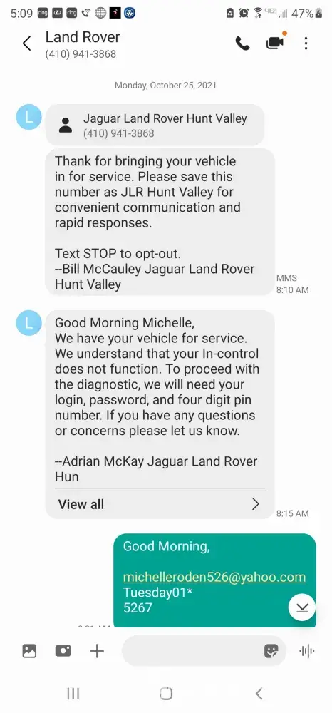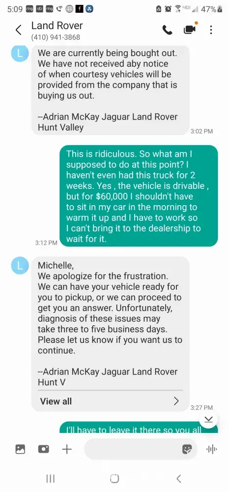 at 8:15 am asking for my username, password and pin number in order to proceed with the diagnosis and they would keep me posted. I never heard anything back so I reached out via text at 2:25 along with a phone call asking if I would get my vehicle back today and if not I would need a loaner. I was advised that they were still in process of determining the problem and they had no courtesy vehicles and would need my vehicle for another day. After asking when they would have a loaner vehicle available, I was told they were being bought out and had not received any notice of when courtesy vehicles will be provided. I was then told that I could pick up my vehicle or they can keep it to further diagnose the problem which could take 3 to 5 business days. I decided to leave my vehicle, but I reached back out to Land Rover Customer Service to see if maybe they had a solution to my problem since I'm sure there have been other people who had the same issue. The young lady I spoke with ( I believe her name is Patrese), contacted the service department and spoke with the Service Manager Grant. Grant informed her that my vehicle has yet to be in for service and is scheduled for tomorrow morning and should be in and out. Patrese asked him about a loaner vehicle and he told her because of Covid and the car shortage, they didn't have any. I tried reaching out to Grant but received his voicemail so I left a message . What I don't understand nor appreciate is being lied to. Why have me schedule an appointment and you never even looked at my vehicle, let alone lie to me and say that you haven't come up with a diagnosis . Of course they couldn't because my truck is probably still sitting in the same place that I left it. I have several text messages that I will include below of the lies that I was told which is completely different from what was told to Patrese. I have been inconvenienced by having my vehicle sit in the shop without it ever being looked at and now I have to be inconvenienced yet another day when someone should have resolved this issue today like they were supposed to do. Not once was I able to communicate by phone with anyone in the Service Department, and had I not reached back out to your Customer Service Department, I would have no clue as to what is going on.