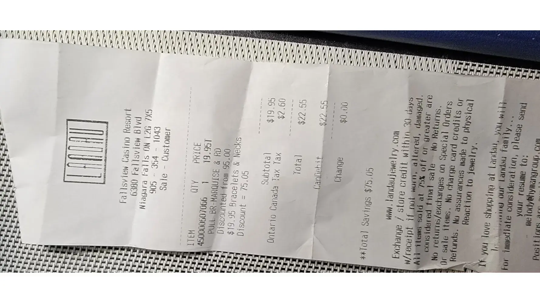 On July 19 2023, I purchased a bracelet at the Niagara Fallsview location for $20. I wore it 3 times and it has broken already. I know it was only $20, but I should be able to wear it more than 3 times. I can provide pictures and receipt.