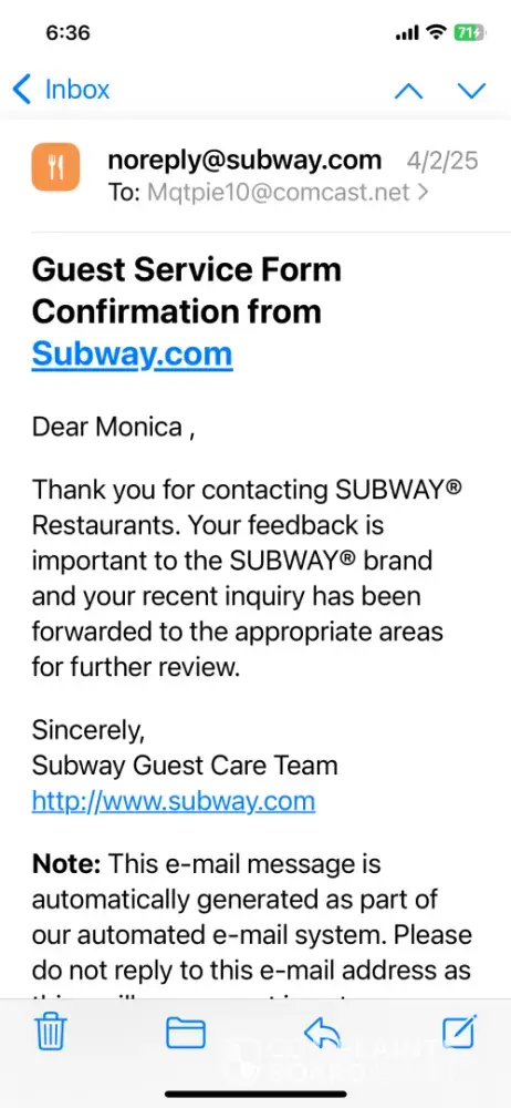 I’m still waiting for a response email sent to Guest Services for an order placed on 4/2/25. I ordered a footlong baja chipotle chicken which was missing the chicken.