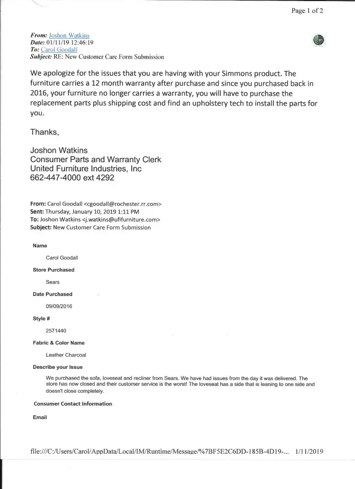 On 1/11/2019 I emailed Customer Care at United Furniture Industries, Inc.