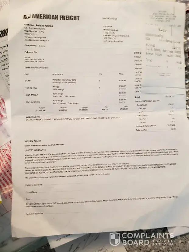 I bought a couch and loveseat at the beginning of April last year at American Freight Furniture in West Plains MO. I have had multiple claims on this furniture and it is garbage! The arm is caved in, the fabric is peeling and this was only after a month! I filed a claim, and "the law tags were not good enough" the next one I filed, the same answer... I have made at least 50 calls checking on the status of our claim. And remember, time goes on... and it gets worse and worse! I am embarrassed for people to come in our lake house because the shape of the NEW furniture is horrible. I will not buy another piece of LANE furniture again. I even paid extra for an extended warranty on this furniture! The law tag that they require, is underneath one of the legs of the couch... I would have to remove the leg to take the picture that they are wanting!
