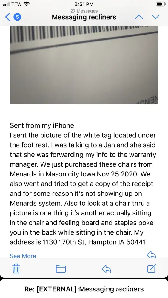 We purchased two Lane recliners from Amazon on May 17 and they were delivered on May 30, 2019. On one of the chairs the support on the rear bottom the plywood broke where a hole was drilled. As a result the chair is falling apart in two directions. The left hand arm is about to fall off. I do not see a way of repairing it. I have pictures but there are on a computer that crashed last week. If you send me your email address I will send them from my phone