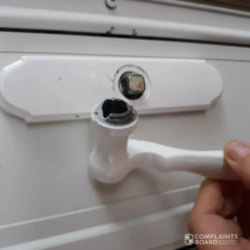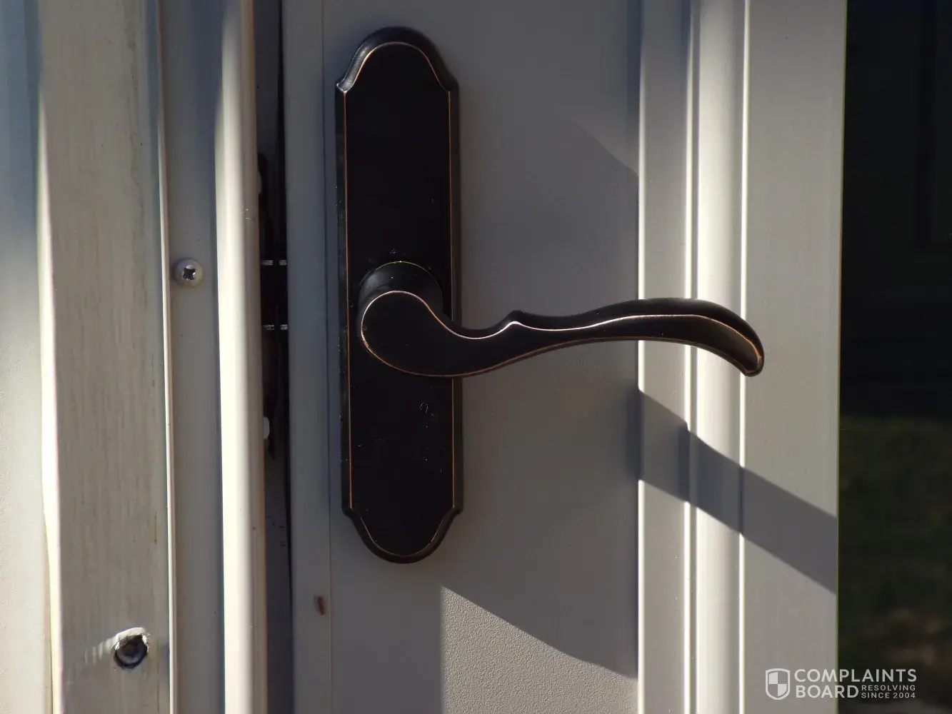 This is the second time the handle has broken. this time it locked me in the house and I had to go out the back door and pry it open with a screwdriver. Then tape it so it doesn't lock me in again. I am 76 years old and on a fixed income. I try to buy wisely the best products. This purchase was from Lowe's in Greensburg, PA 15601 and installed by them 10/14/10. I am very up set over this. My door is now free standing with not latch for the wind to blow off.