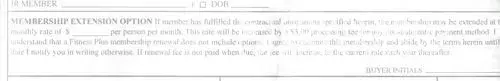 "membership extension option if member has fulfilled the contractual obligations specified herin, the membership may be extended at the low monthly rate of $_ per person per month. This rate will be increased by $3.00 processing fee for any non-automatic payment method. I understand that a fitness pluss membership renewal does not include options.