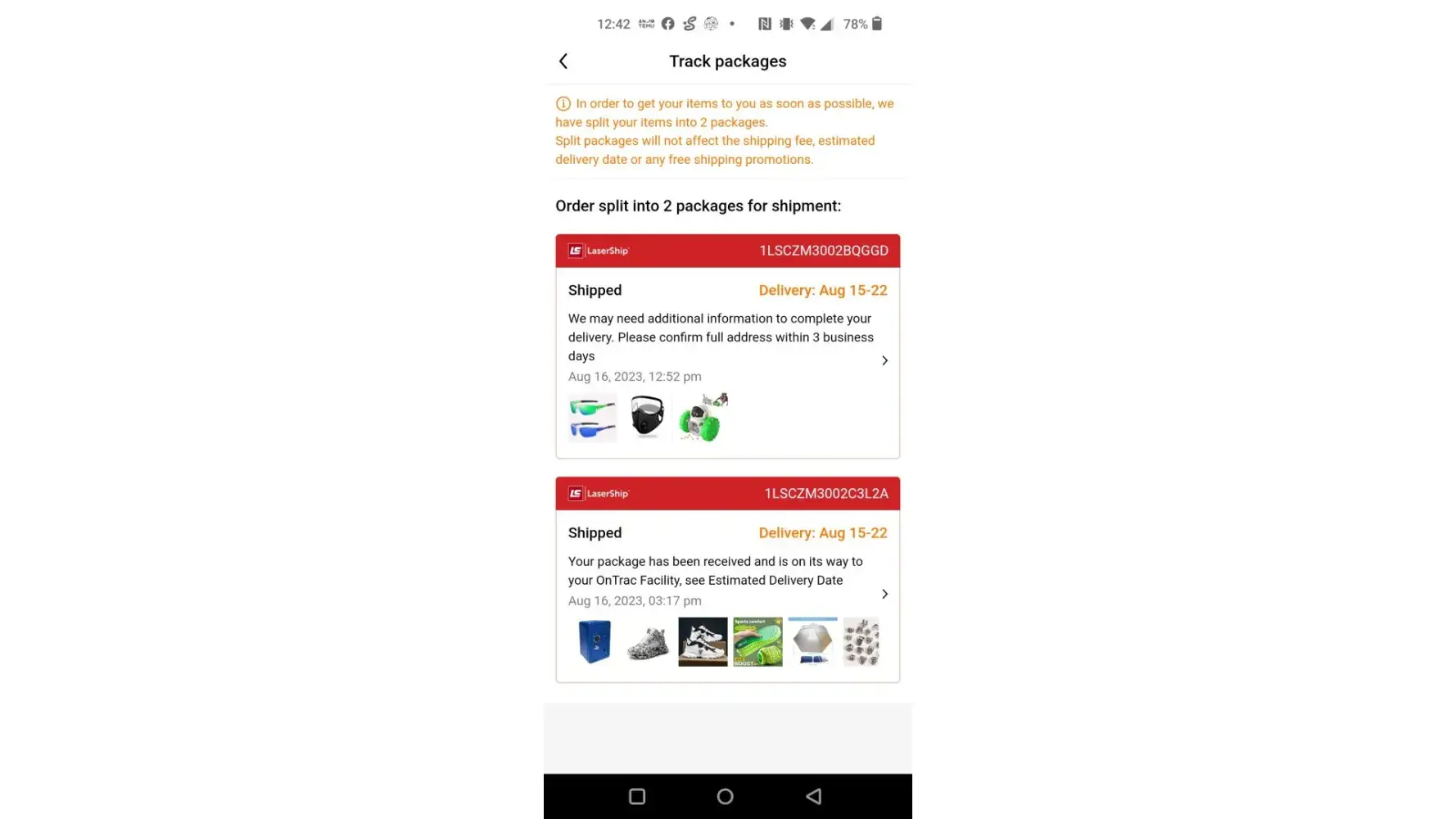 8/16/2023 Lasership delivered did not happen. On Lasership page says they did not have address to deliver my package at 5:40pm. At 10:15am Lasership delivered my package at my place. Nope they did not. Then add another package was part of it was on 8/17/2023 LaserShip delivery. That didn't happen. At 3:30 p.m. package had delivered at my place at 11:10 a.m. next door on the left side. That didn't happen. No truck no person no pictures no video and no packages at my place on that day which is today. Trying to talk to them but nothing computer will not do nothing for you make it worse just like that company is and I'll see I believe they stole it but not. I have more package unfortunately come from them. To me I'll never use those people again leadership is definitely not leader!