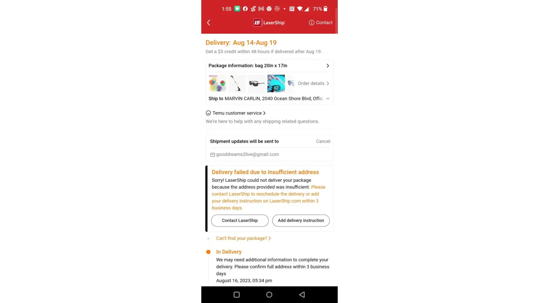 I was awaiting a package from oldnavy.com being delivered by lazership. I checked the tracking last night 8/24/2023 at 11 pm and it showed awaiting package from carrier. So I added delivery instructions for my package to not be left unattended and for delivery driver to knock on my apartment door before leaving my package unattended. This morning I checked the order status from oldnavy.com and it showed returned for refund. When contacting oldnavy.com they said that the delivery company marked my package as unable to deliver so oldnavy automatically put it for returned for a refund. What I don't understand is how did it go from8/24/2023 at 7:40 pm awaiting package from carrier to undeliverable? When checking my tracking info it doesn't even say anything aside from waiting for parcel as of 8/24/2023. Did lazership even receive it? It's bad enough I was already receiving it late, I needed what I was awaiting for for work and now I have to either reorder it again or figure something else out! This isn't the first time I'm having issues with lazership and packages being delivered to me. I've had shien packages stolen because lazership left my package in my lobby. I've had a Walmart package stolen because they left a package by the elevator doors. I've had lazership leave another oldnavy package without knocking at my door thankfully I got that one because I happened to be leaving and saw it. And I've had several situations where, like this one, it goes from I'm waiting for my package to lazership claiming its undeliverable! Lazership is not a good delivery company! I'm complaining because drivers, or perhaps company as a whole, think that if an excuse exists and can be used then that's the go to option as opposed to delivery of packages! I wish I had a choice in companies using lazership because I'd chose not to! I receive all my packages with much less issue from every other delivery company. Every time it's lazership I know either I have to stay at my window awaiting that little yellow truck or my stuff will be stolen or I won't be receiving it at all because of some bogus reason! I hope someone figures out what the problem is, trains the delivery drivers better so they can take their job more seriously or something. Because this is just ridiculous!
