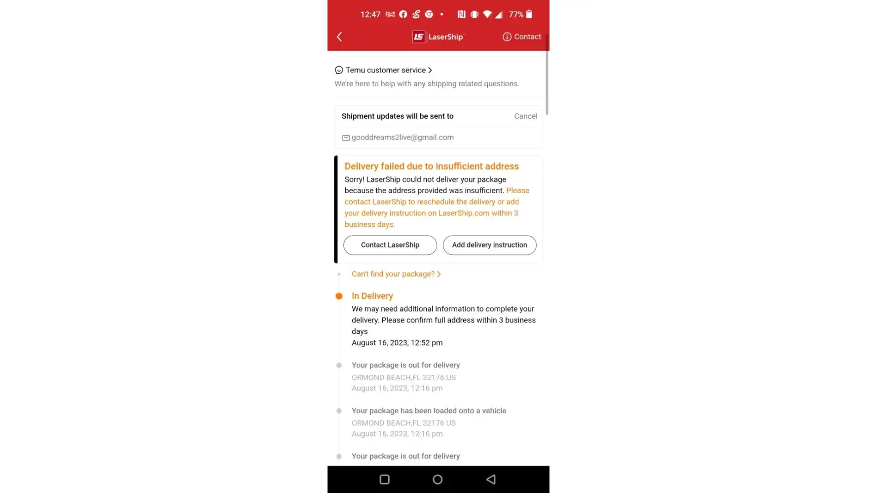 This company has the worst customer support syatem i have ever seen. You can look online and you'll find 4 seperate "customer service" numbers, which all link back to the same automated answering system. From there, you'll get 5 choices, which all result in the same automated message telling you to go to the website and fill out the form at the bottom of your tracking history. There is an option to text with a live agent, however after a few exchanges, they tell you to go to the website to fill out the dorm at the bottom of your tracking history and then they cease all communication. I recently ordered parts for a time sensitive project from an online vendor and 2 out of the 3 packages shipped with lasership. The packages arrived at the local processing warehouse 3 days after receipt from the vendor. There they became stuck in a "doom loop", being loaded onto a truck for delivery, driven around for a couple of hours and then taken back to the warehouse because the shipment needed more information for delivery. This process continued for 3 days, even after filling out the aforementioned "form" every time the shipment was returned, and finally on the fourth day, the company attempted delivery at 615pm to a facility that closes at 5pm, every day. After the attempt the shipment was returned to the warehouse which is less than 30 minutes from the delivery location where it sits today, awaiting more information for delivery with an updated delivery date 3 days from now, nearly ten days after it was initially expected.