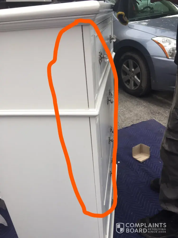 Delivery people not careful with furniture... dropped... oops... only a little dented... But it would take weeks/months to get a new one...