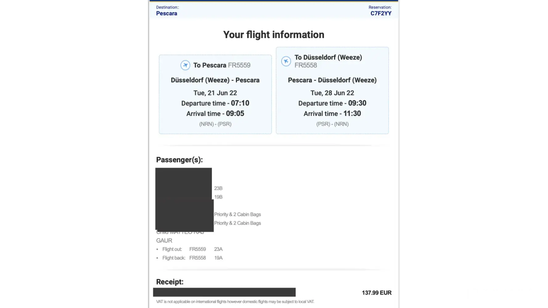 9. (9.June) We asked for a change of date then, another option was cheaper. Again Düsseldorf Weeze - Pescara, Italy. Just 1 day later. Online the ticket was available for 130€. Again, they would send the request to the other department to check the tickets and to send us the offer.