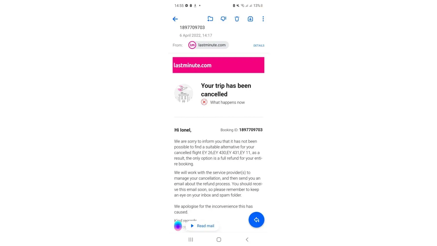 Ryan air then went on to confirm they had refunded the flights (as it was a death) on the 29th October 2021. I have had nothing from lastminute.com and everytime I ring to enquire how long it will take I get told a different story as to why I haven't got the money.