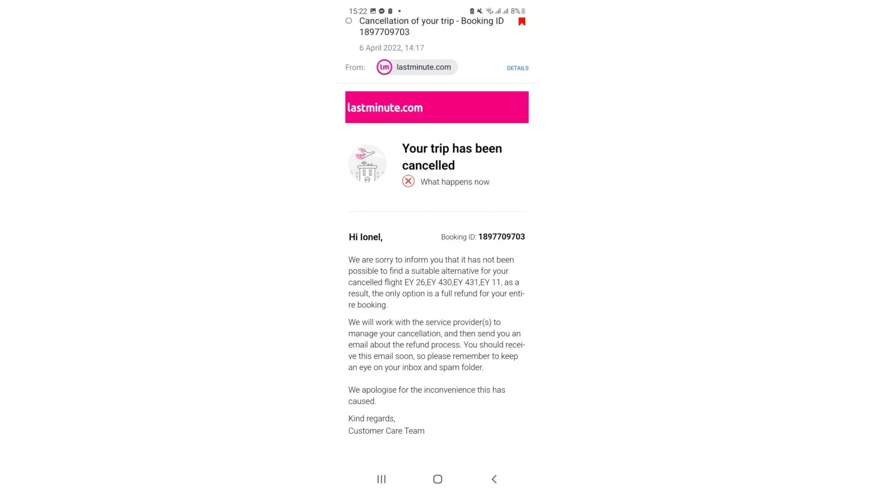 I believe the quality of service could be better, especially given the advertised quick resolution of the Covid-19 related cancelations. I would have gladly accepted a refund, or a voucher from LastMinute.com, but nothing like this was even mentioned to me.