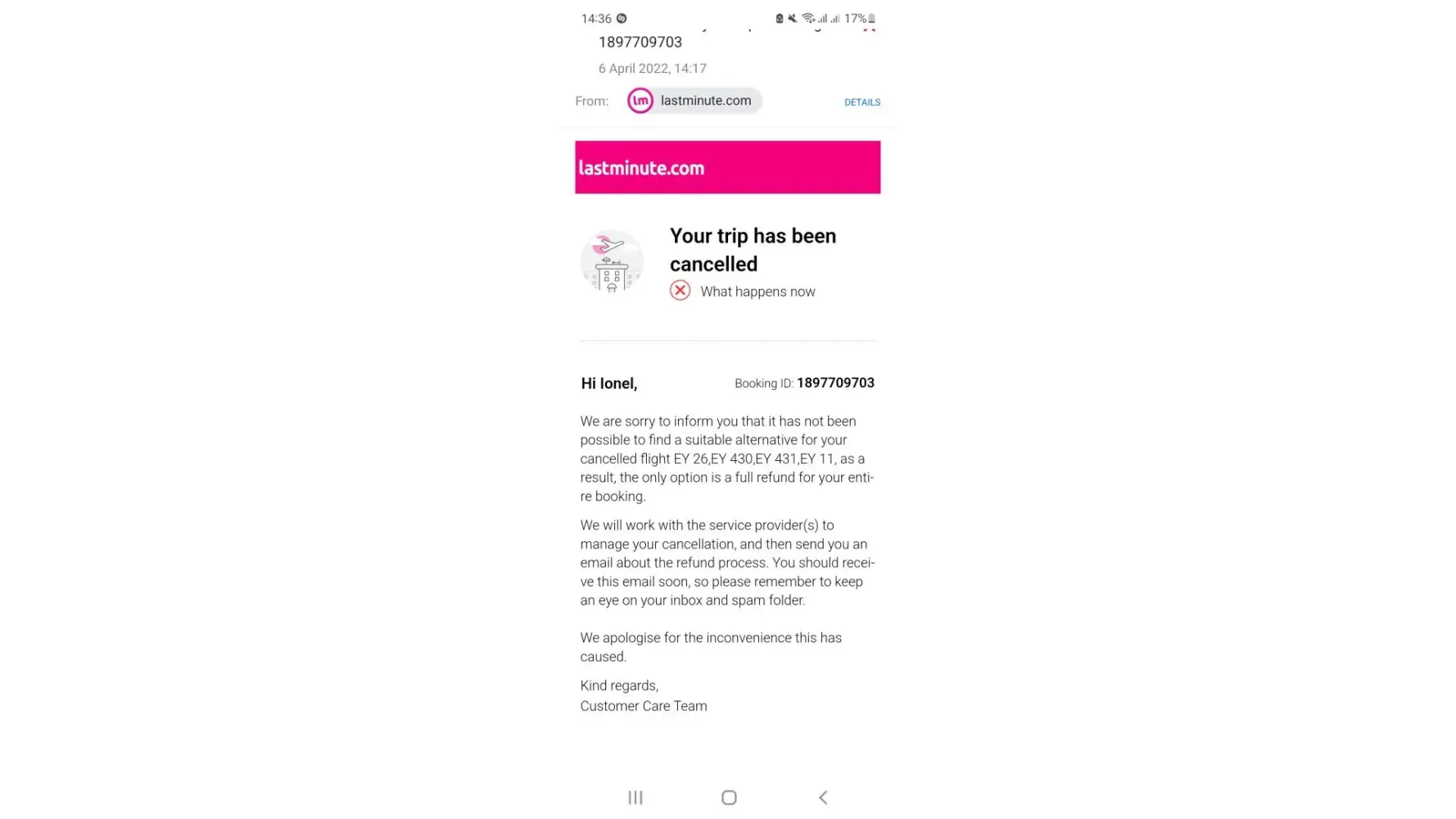 Desired outcome: I would like to have the booking refunded, including the plane flights and hotel reservation costs, or at least to receive a voucher for making another booking.