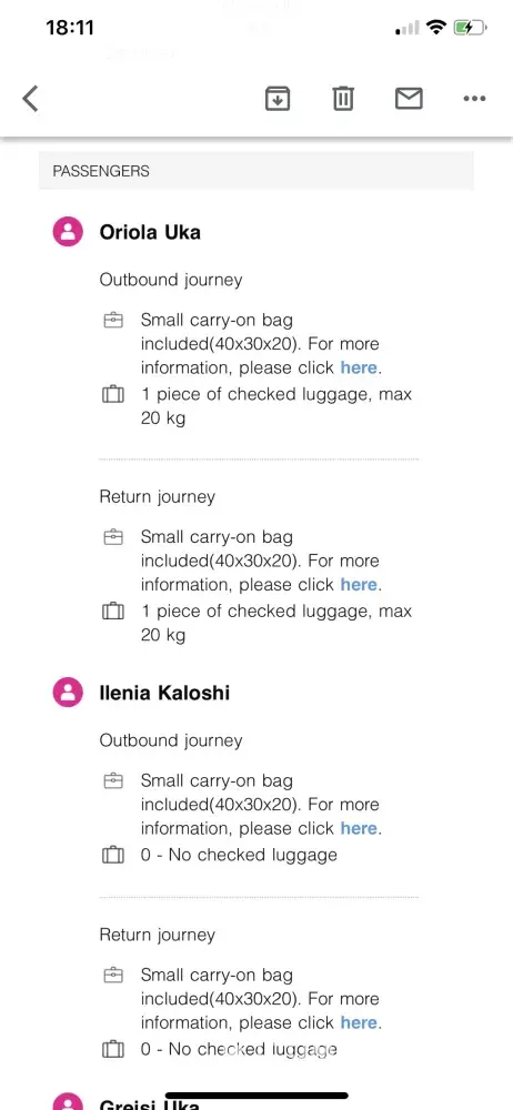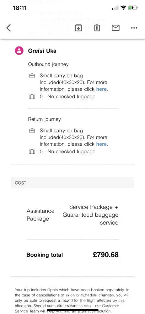 Desired outcome: Confirmation of our booking/flight with checked luggage that we have already paid for and confirmation of our car rental