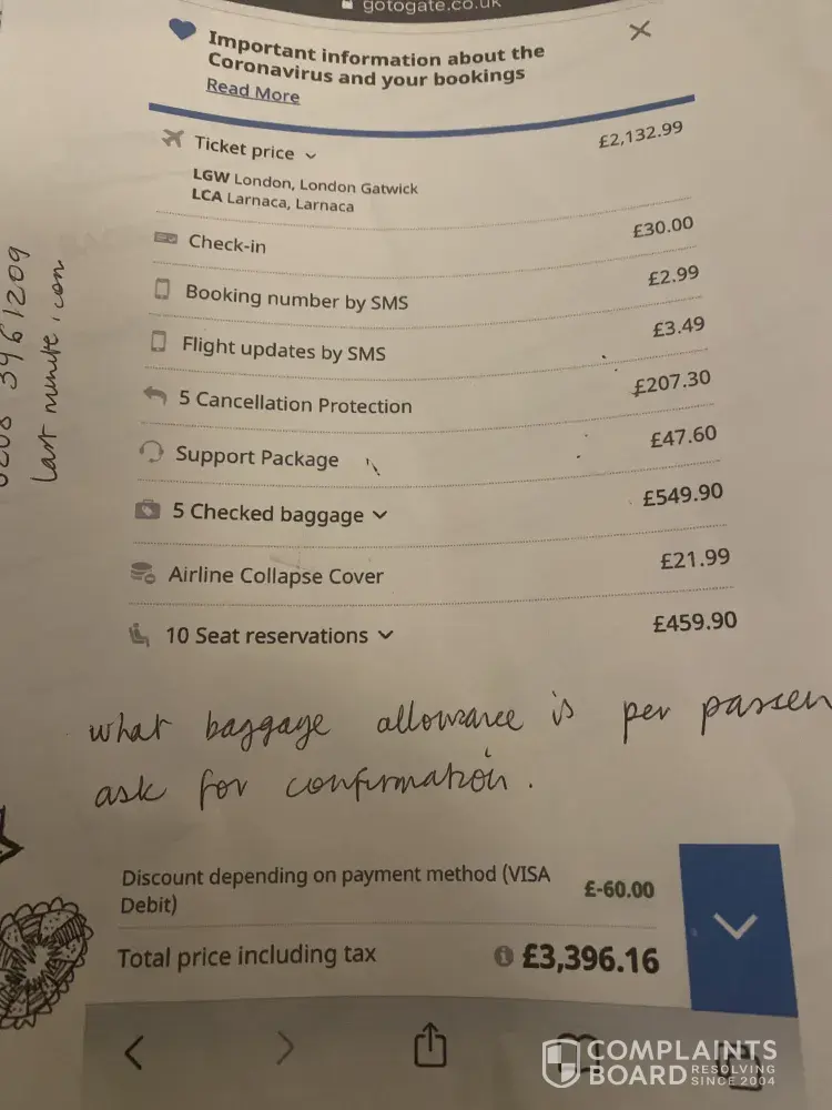 On the same day a man from Lastminute called and said as I was having trouble he could help, he quoted £325inc. bag and seats, said he'd ring back tomorrow.