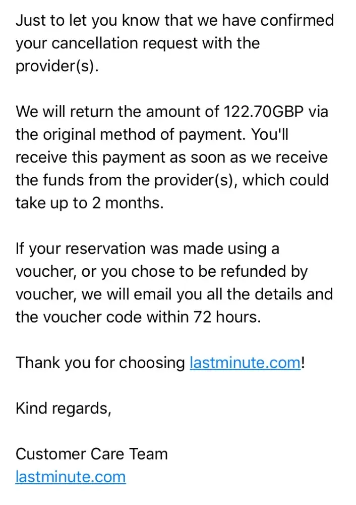 The 28th September I've received another email from the customer service (email address noreply_en@lastminute.com, in a very informal way with just plain text, at first I was thinking to a scam email to be honest) confirming that they've not been able to confirm the booking and that they were giving me a refund to my bank account of £638.41 (the price I paid extra when I used the voucher) with no options if I wanted instead a full refund. I've promptly called customer service to have a refund and been told to allow 72 hours.