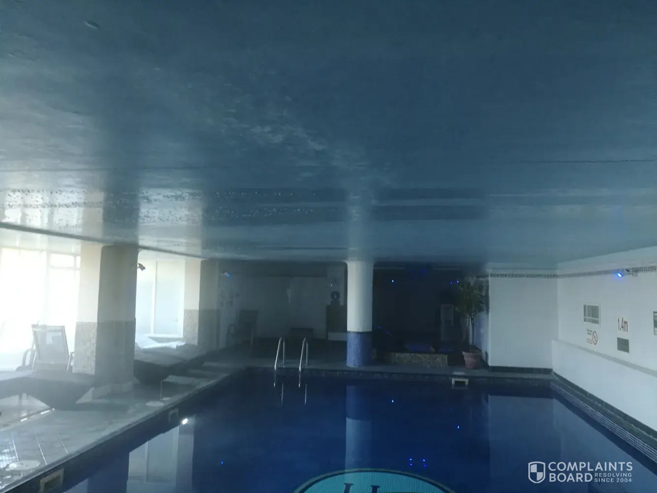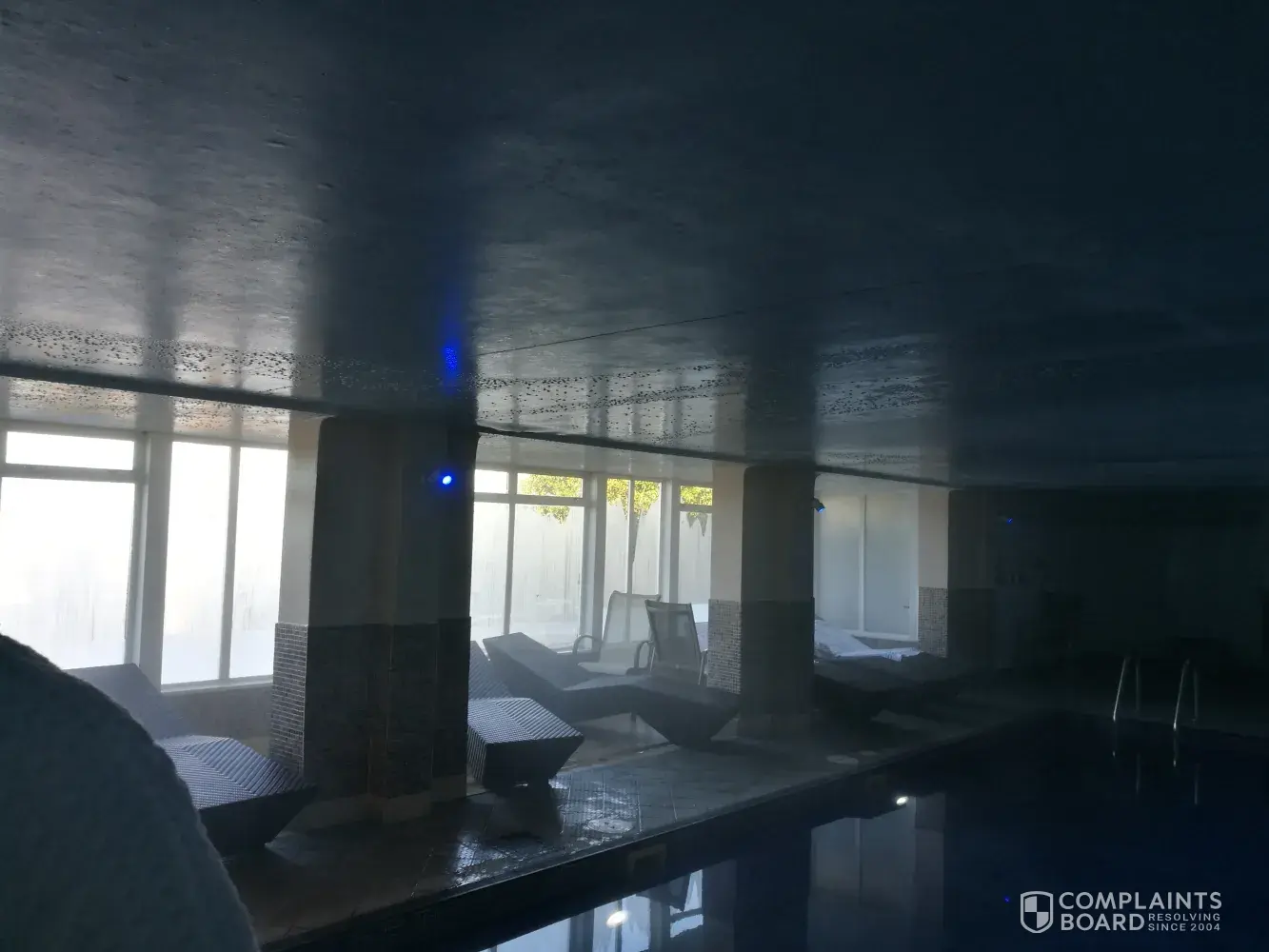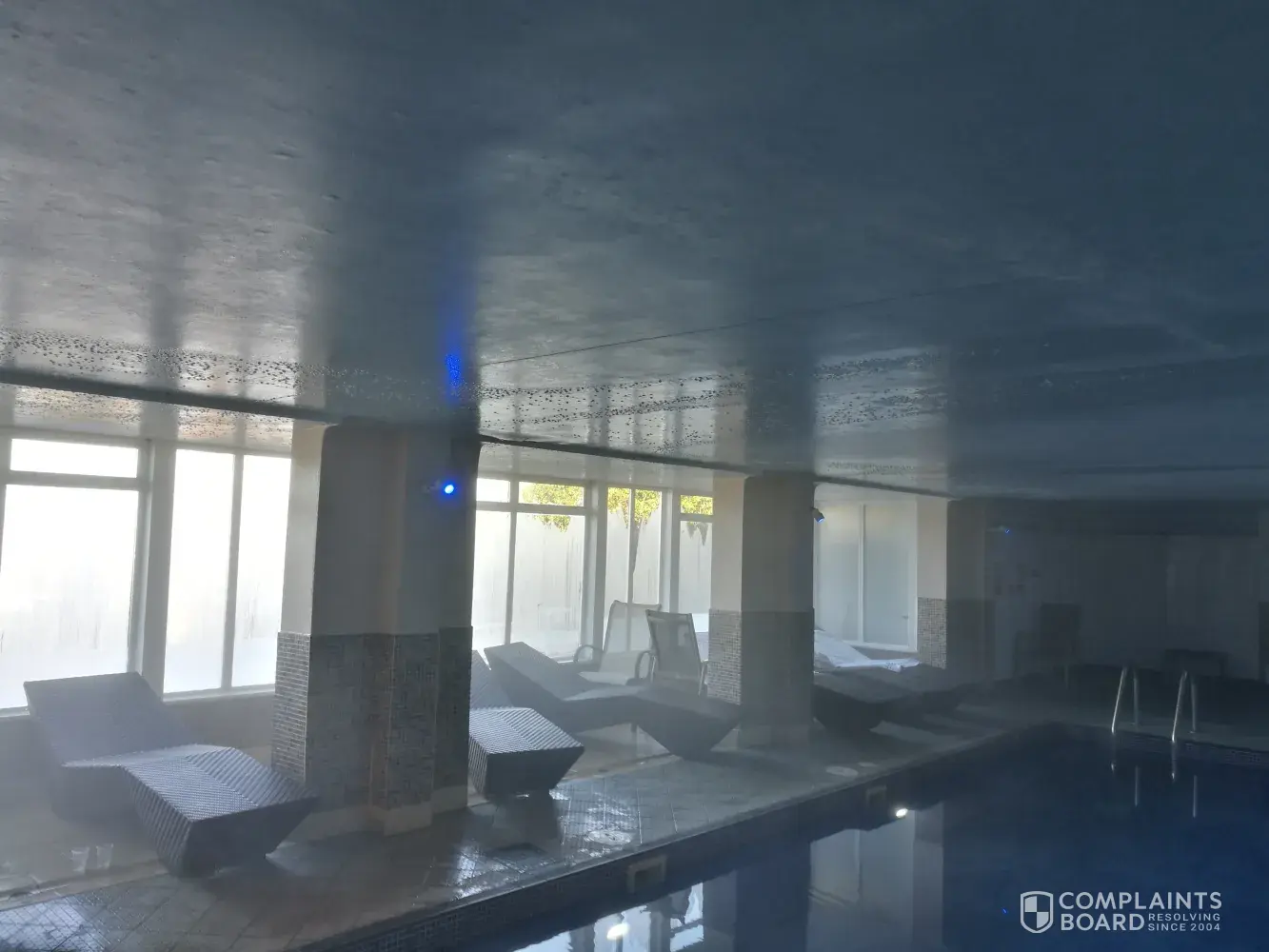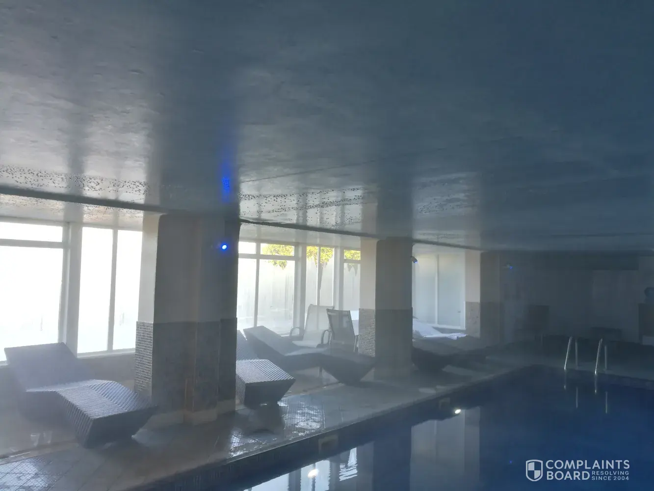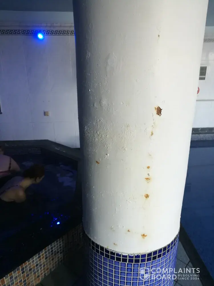 The air was thick and stagnant, the surfaces dripping and moldy, the drains were rusted, black mold was all over the doors and door frames, the ceiling was dripping with rusty drippings right over the loungers and into the pool, parts of the ceiling had fallen down and the floor was incredibly slippery, I personally felt very uncomfortable and uneasy, therefore we decided that sitting in the jacuzzi was the safest bet. As we got in and slid along a tile came loose scratching me. I was absolutely shocked and felt very unsafe, my friends and I had a look and it was apparent that the whole jacuzzi was falling apart, we counted 26 considerably sized holes, a few of which had loose tiling just moments away from braking off and scratching someone like it had me, this is a major hazard and could have caused me serious harm, I am lucky that it was not more severe, however this is completely unacceptable and certainly not what you expect when visiting a golf and Spa resort.