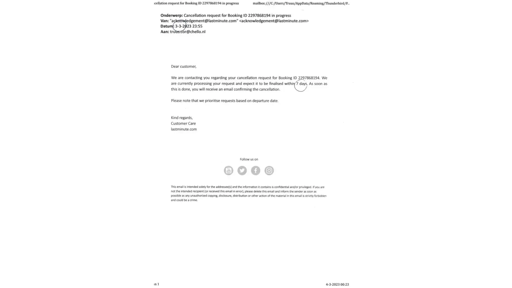 Because I was always unable to reach Lastminute.com, I was very surprised that I received an email immediately after my cancellation and even in the Dutch language stating that an amount of € 2443.72 had been collected. Together with the deposit of € 275.10, that is € 2718.82. They also intend to write off € 206.67 after 22 May, which together amounts to 2925.49. It was not possible to reply to this email.